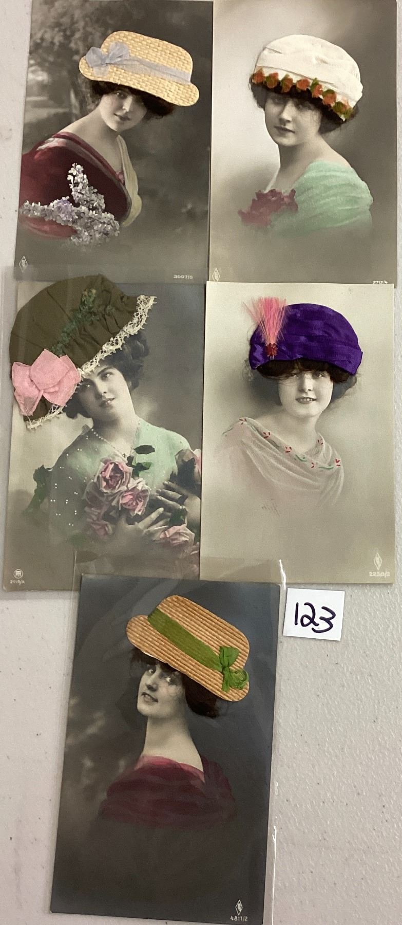 5 real photo real hair ladies with hats postcards. Early.
