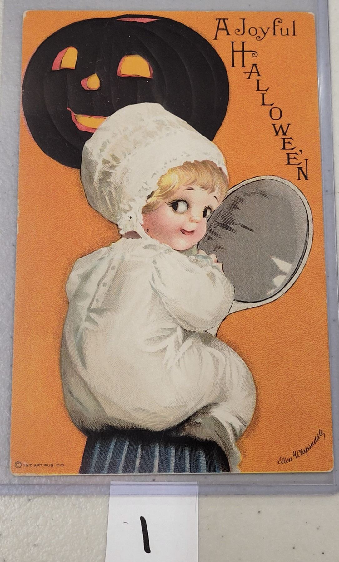 Orange Background Clapsaddle Child & Black Pumpkin Halloween Postcard
