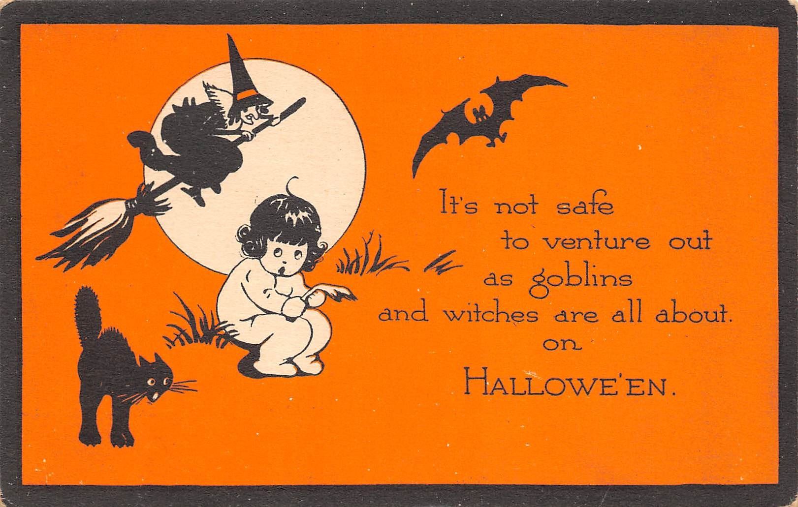 Orange & Black Halloween Postcard by Gibson Art. CO. Witch & Cat