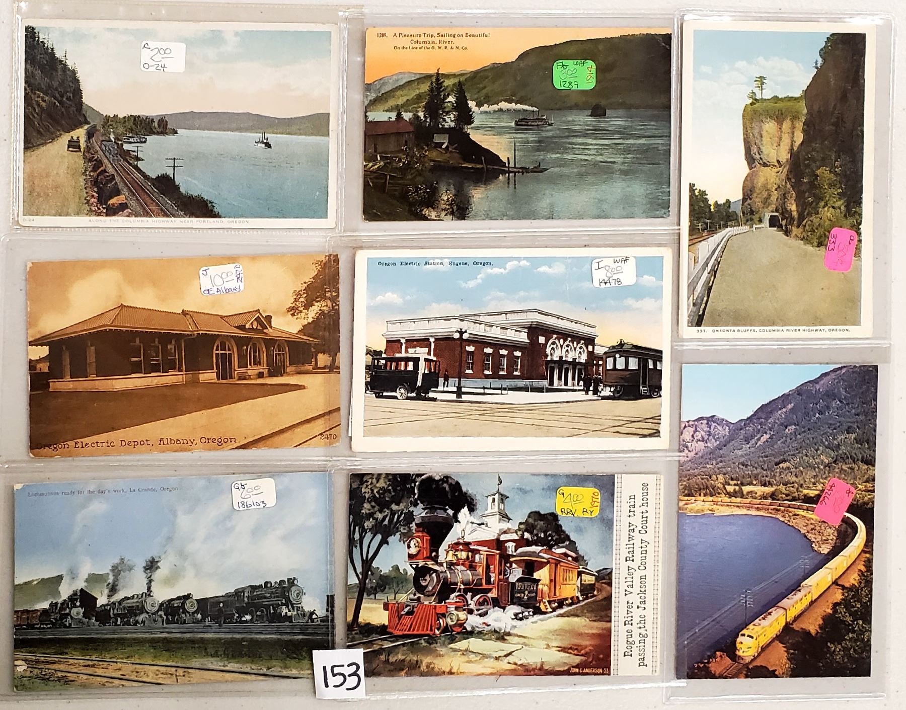 Approx. 90 Oregon postcards. Train, railroad, depot, etc. Early to standard size chrome.