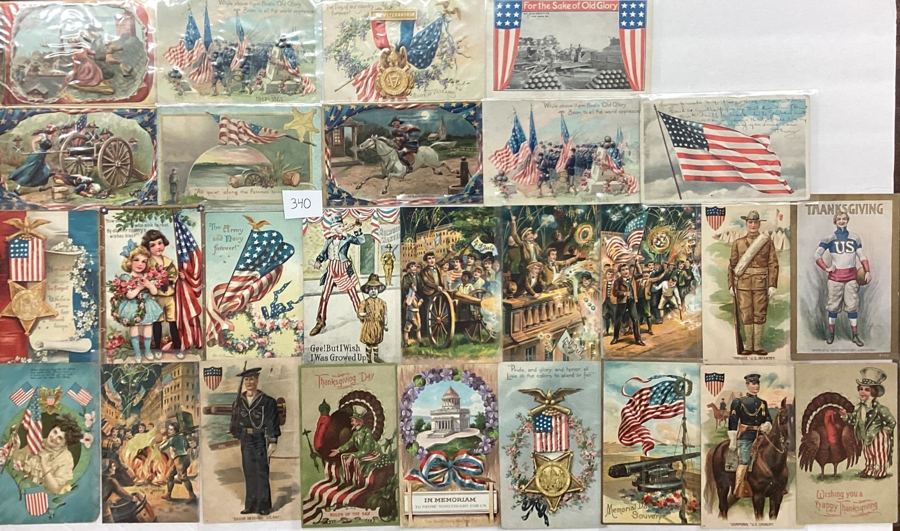 27 Patriotic holiday postcards. A couple Uncle Sam postcards. Some with wear.