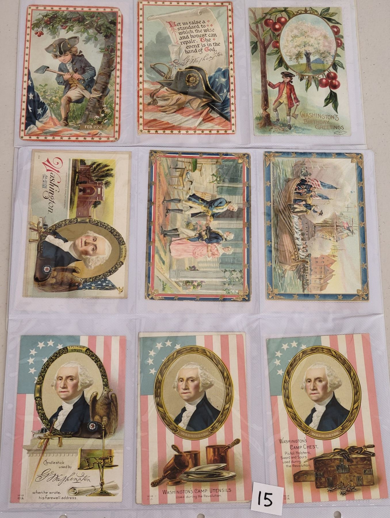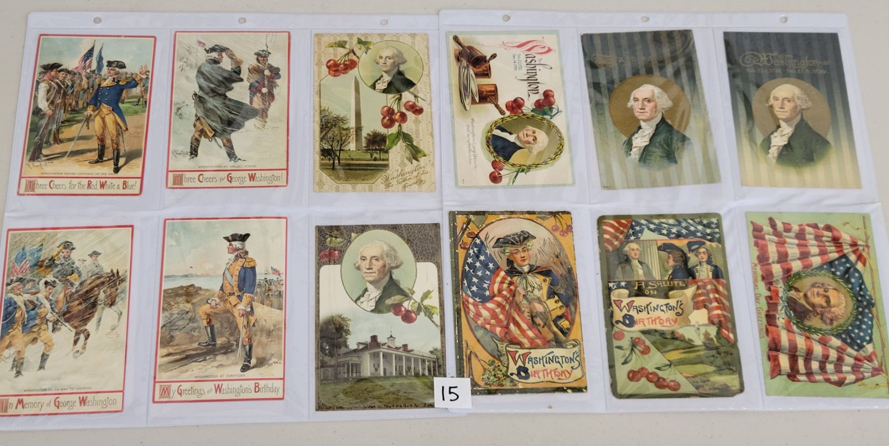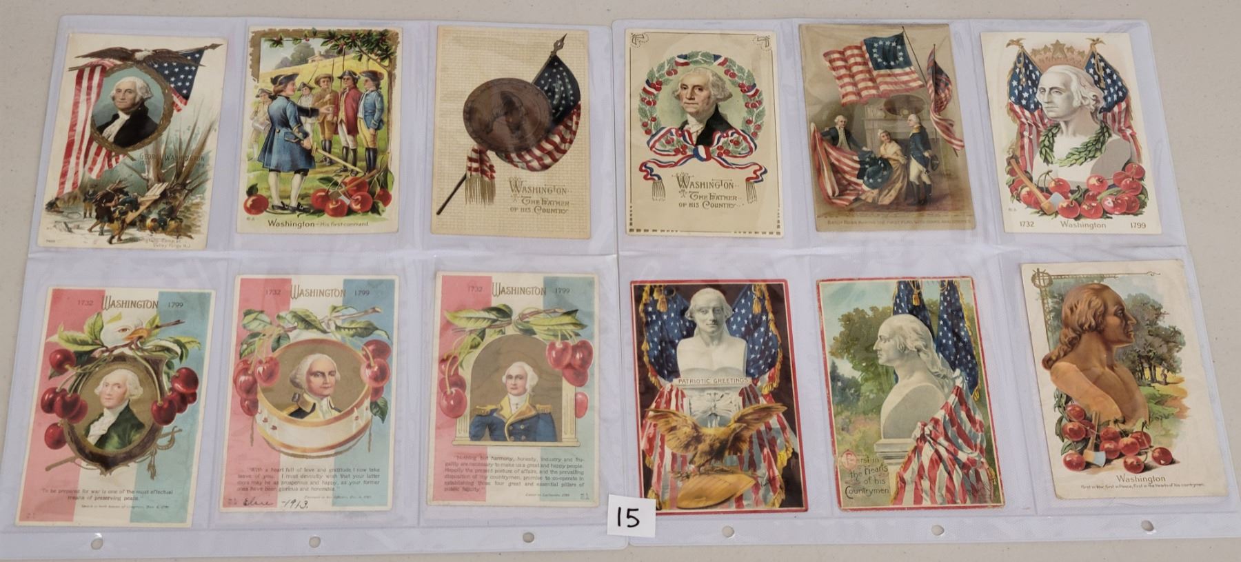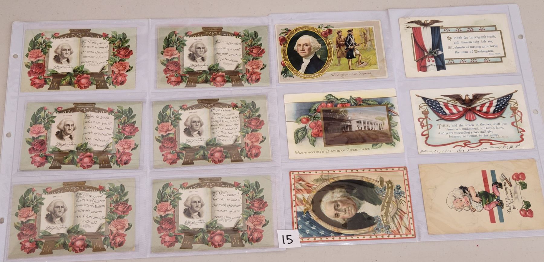 Album of approx. 185 patriotic greeting postcards of Lincoln & Washington.