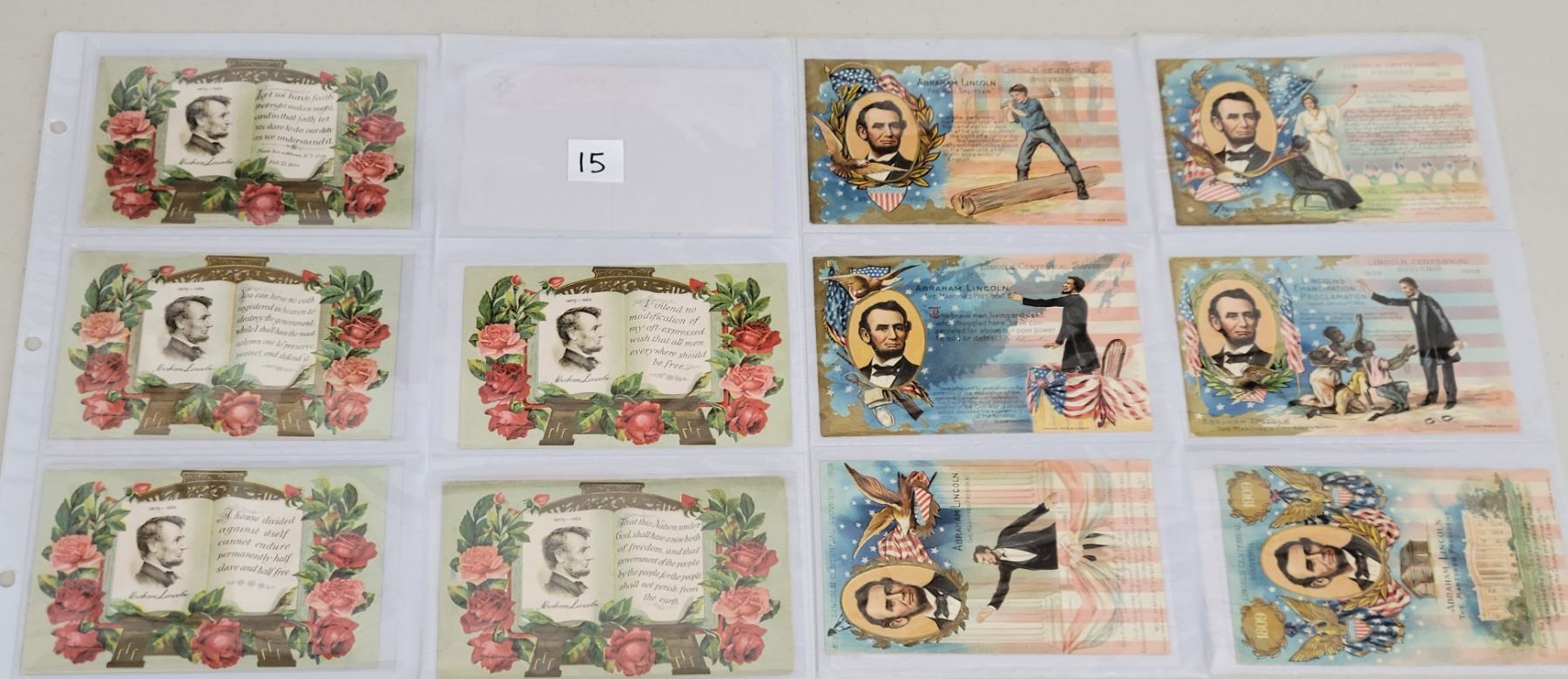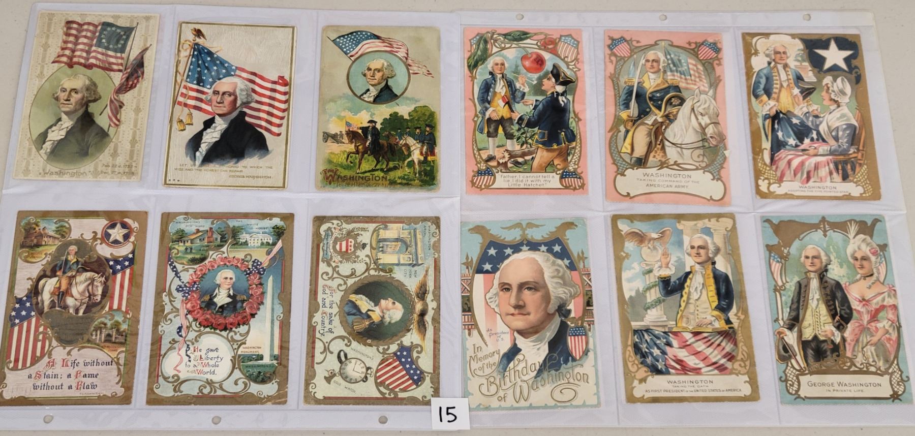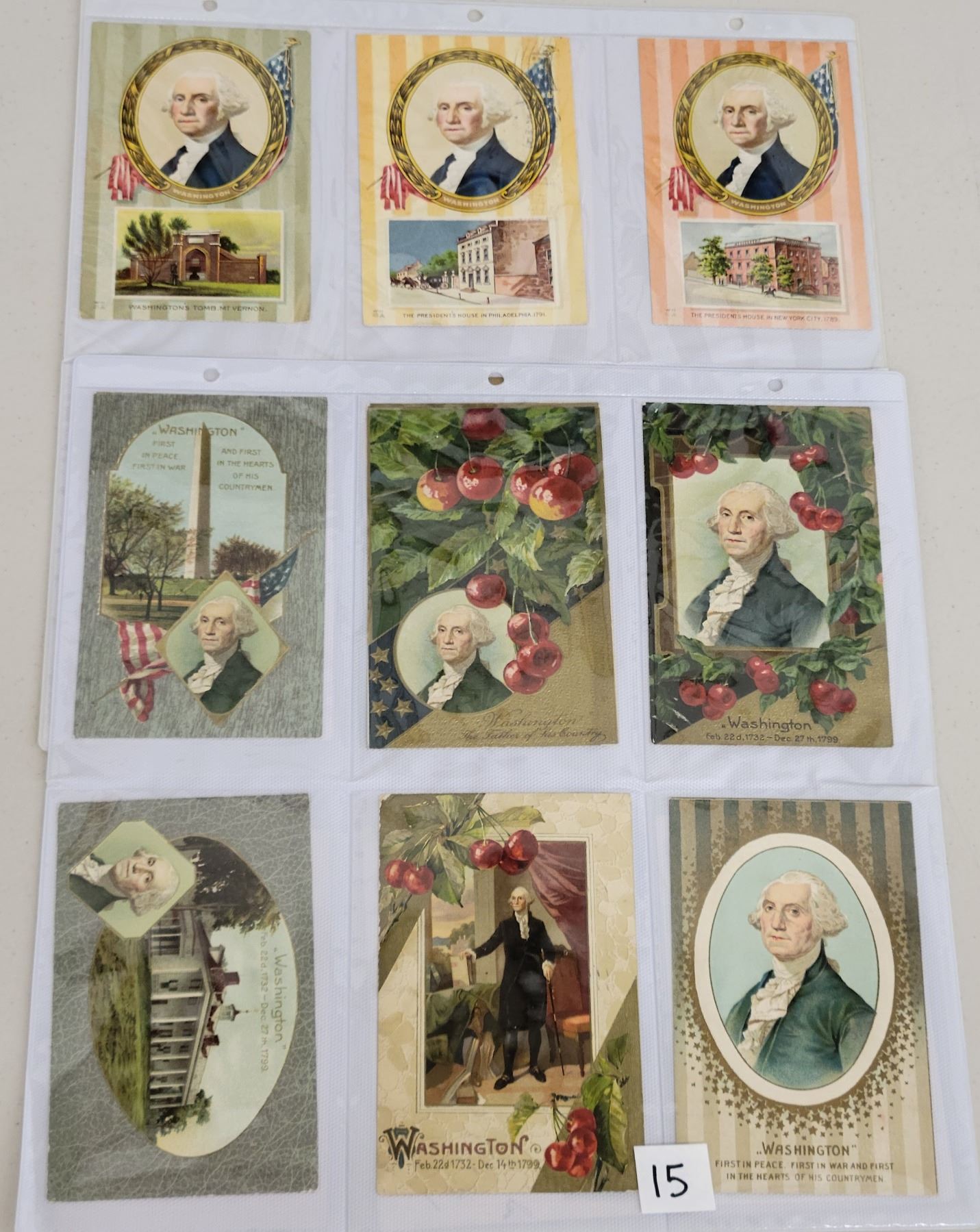Album of approx. 185 patriotic greeting postcards of Lincoln & Washington.