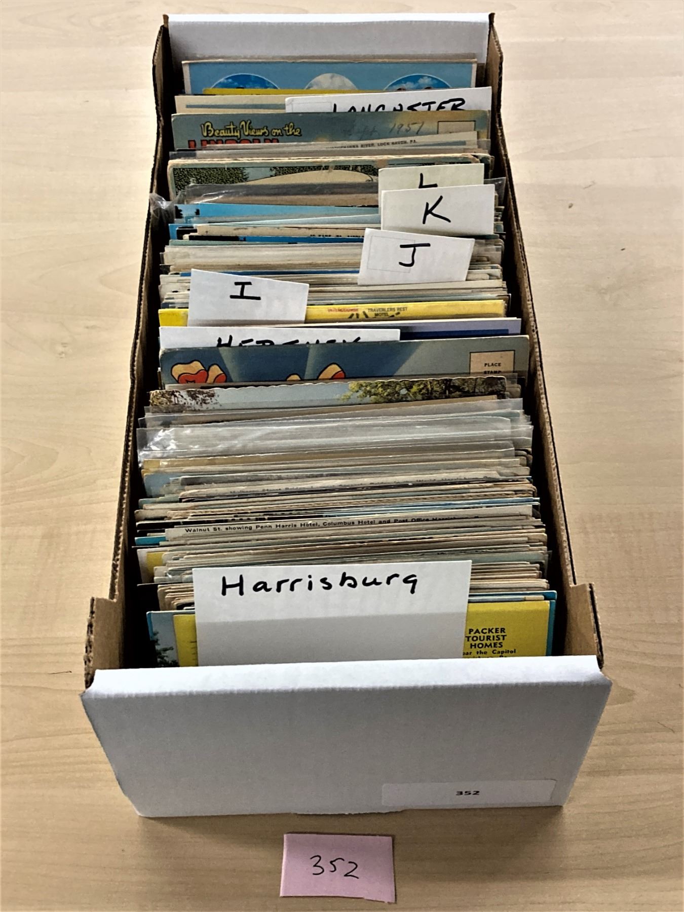 Box of Pennsylvania cards. Sorted Harrisburg to Lancaster, over 2 dozen towns. Early to standard size chrome.