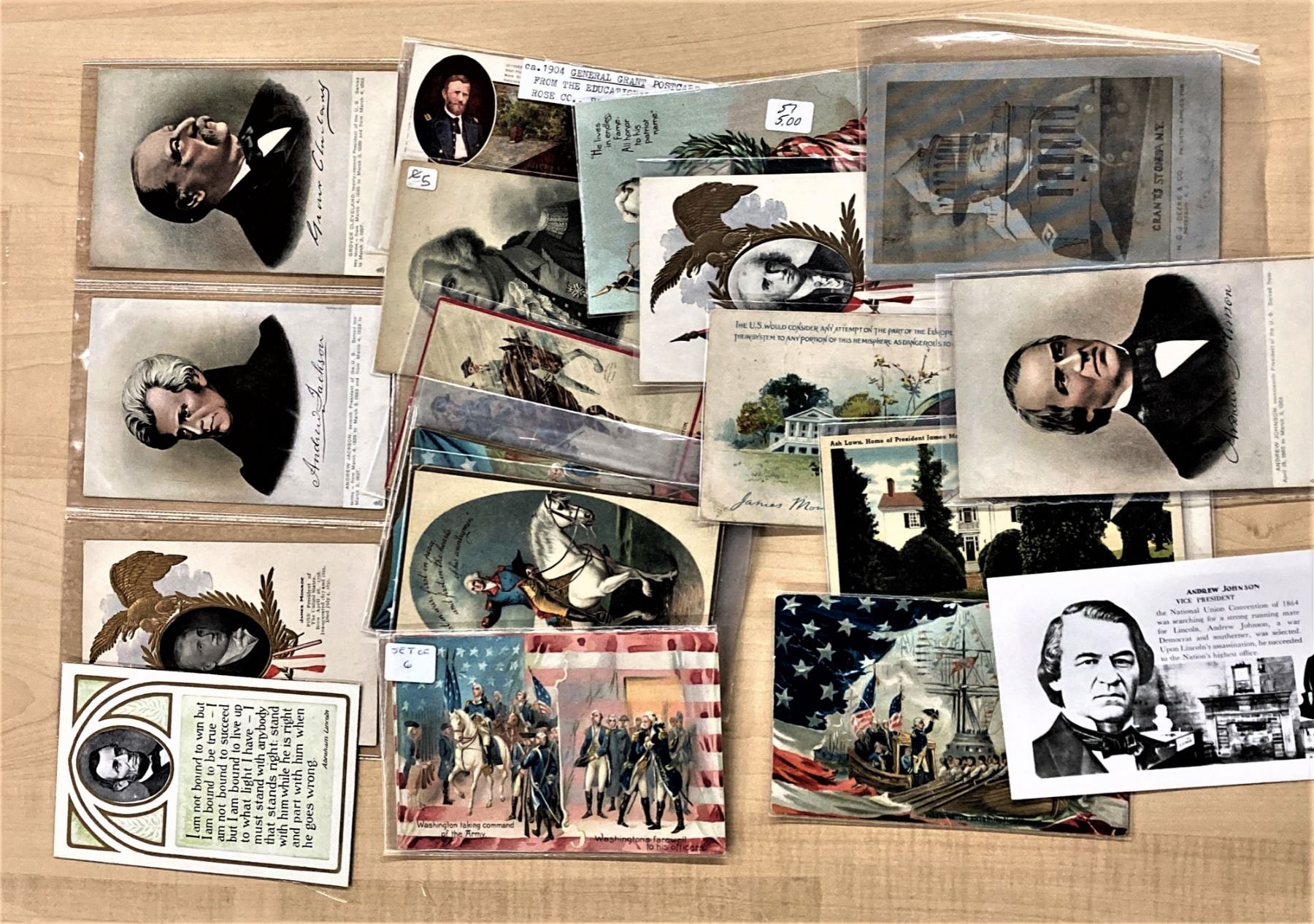 Early to standard size chrome. Presidents and related. Tucks, Photos, etc. Presidents included: Roosevelt, Carter, Lincoln, Pierce, Taylor, Fillmore, Harrison and many more. Approx. 300 cards. Pictures shown are just a portion of the lot.