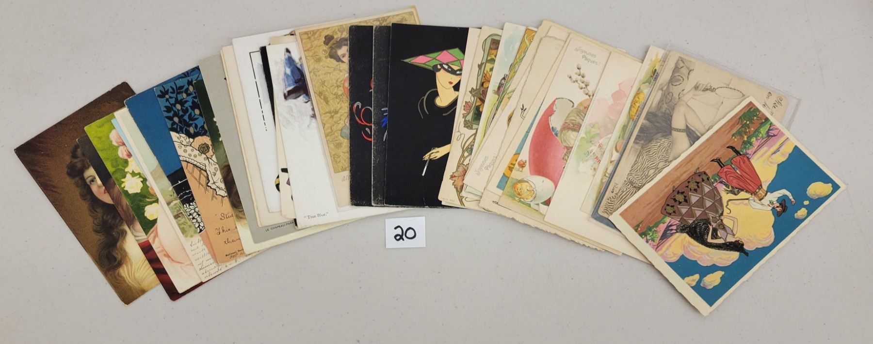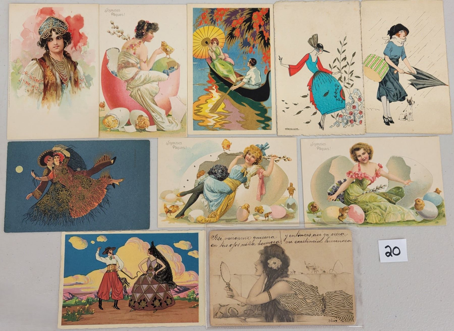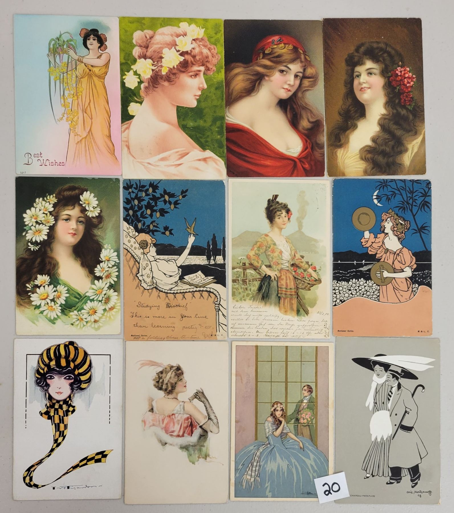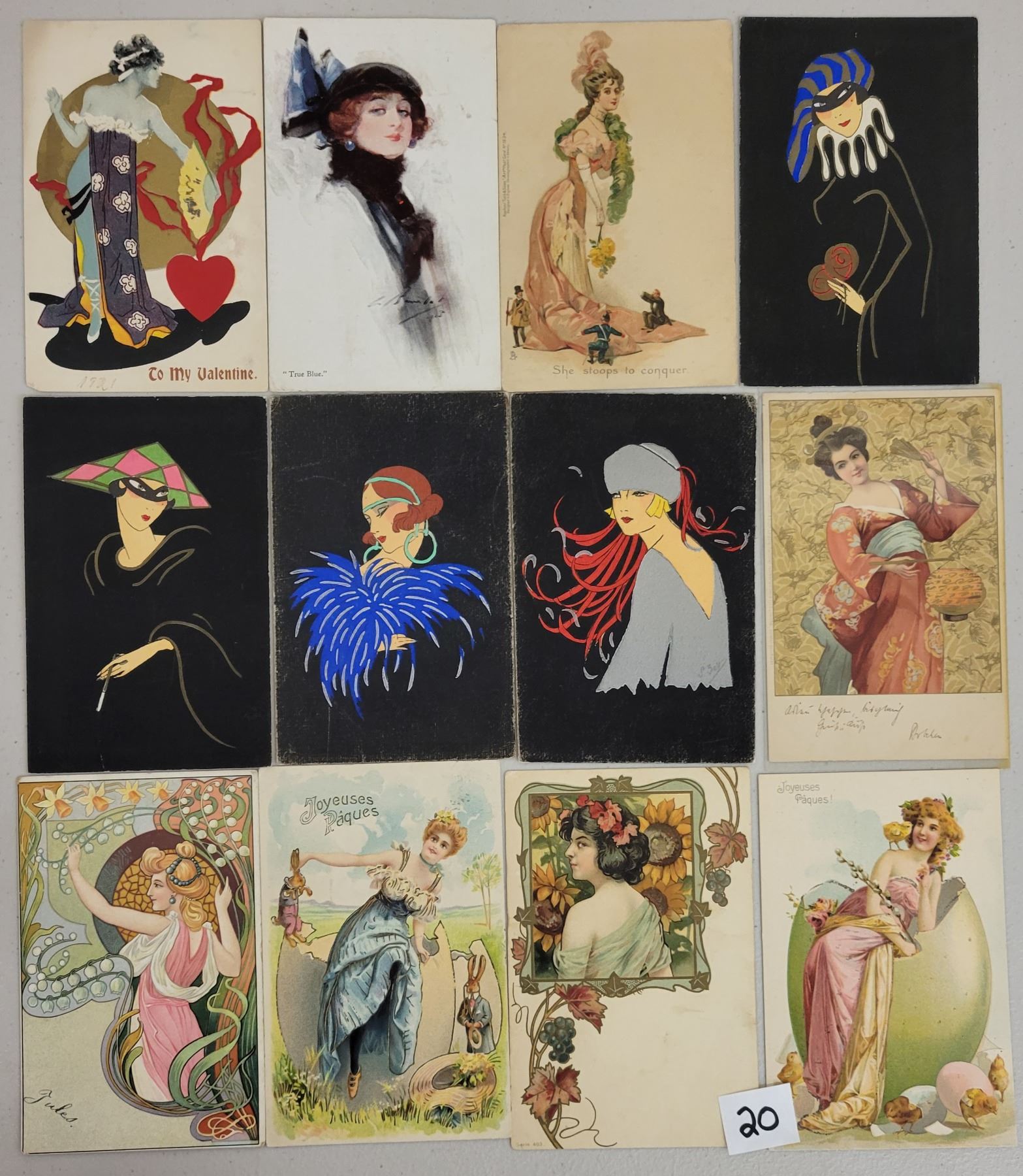 34 postcards of ladies. Signed Artists, Kirchner, holidays, art nouveau, etc.