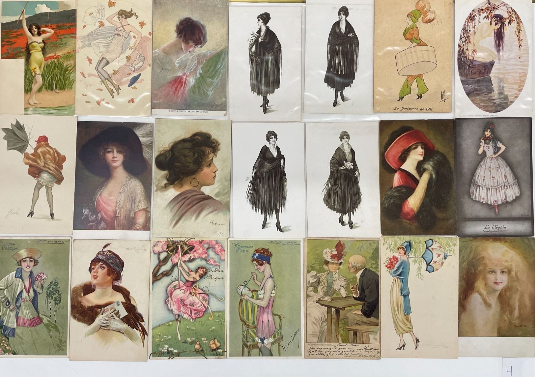 Over 40 pretty lady postcards. Many signed, Art Nouveau, etc.