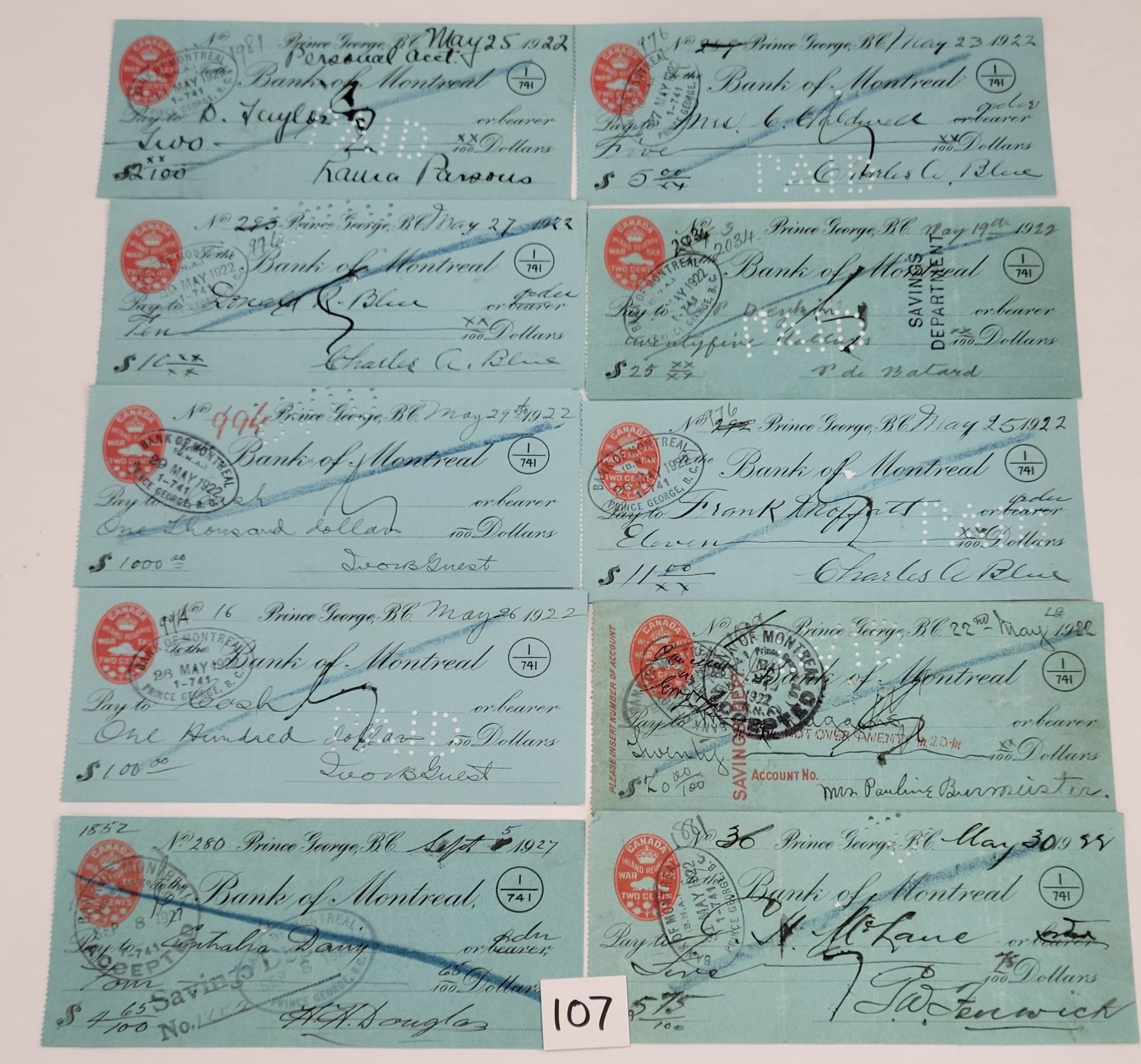 Prince George, British Columbia Canada Bank Of Montreal Checks, Notes Approx. 65