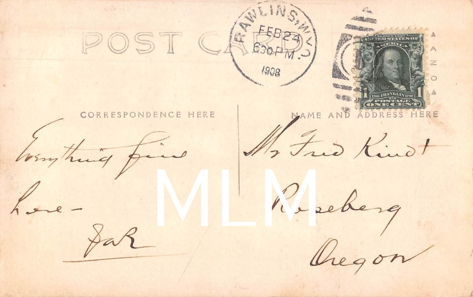 Interior Rawlins Nat'l Bank Rawlins, Wyo. Capital & Surplus $150.00. Postamarked 1908, Rawlins.