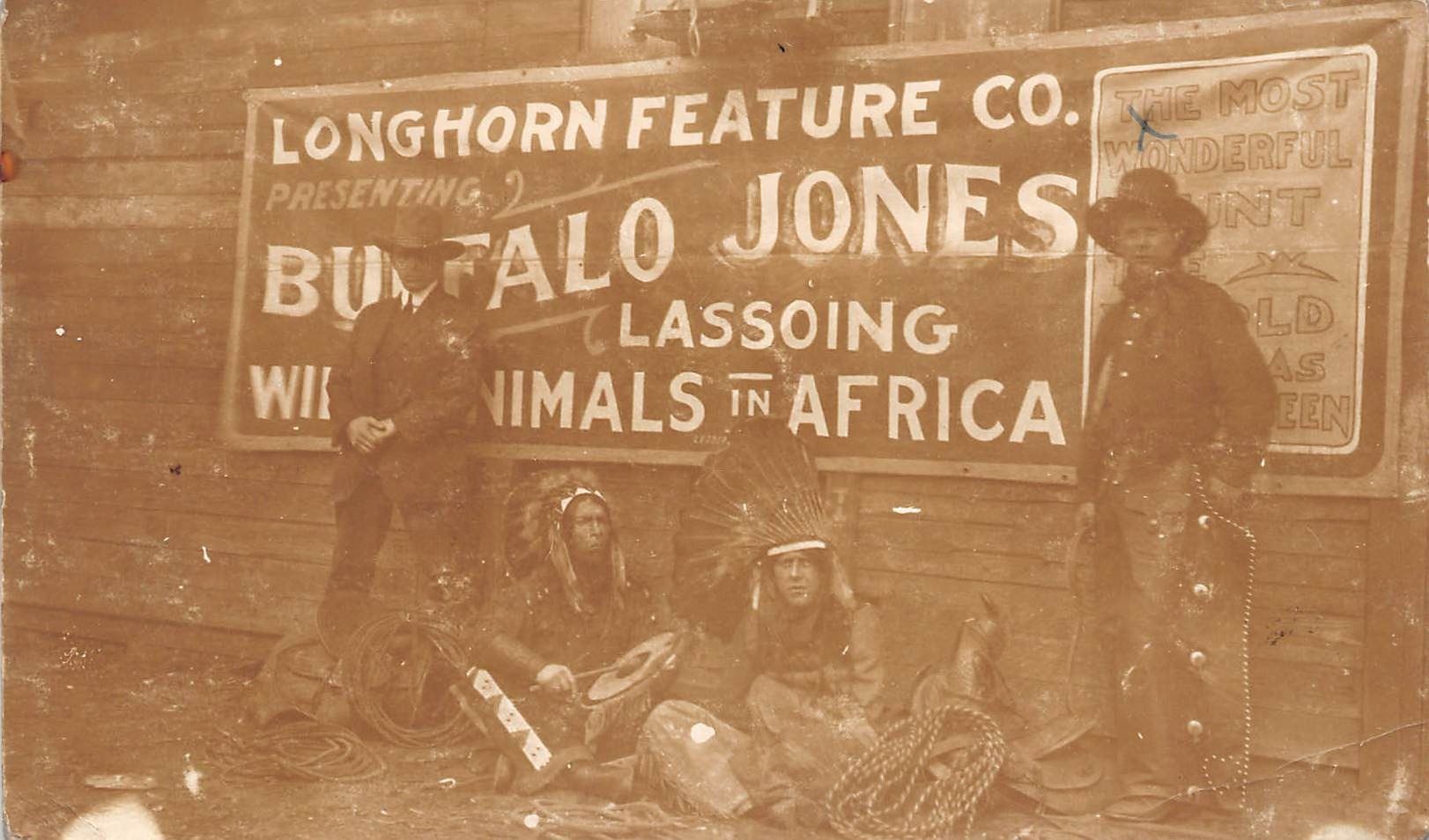 Real photo Men gathered in front of sign reading: Longhorn Feature Co. Presenting Buffalo Jones Lassoing Wild Animals in Africa". Undersized and top edge is trimmed.