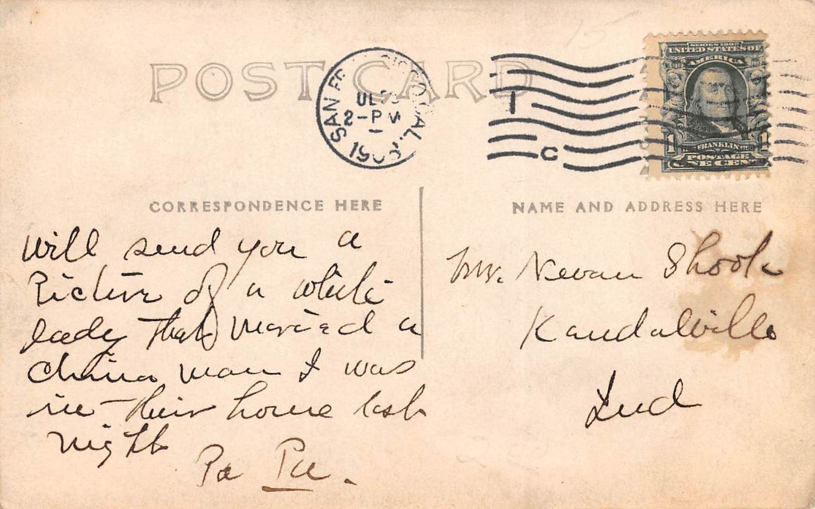 Message reads: Will send you a picture of a white lady that married a Chinaman, Postal used.