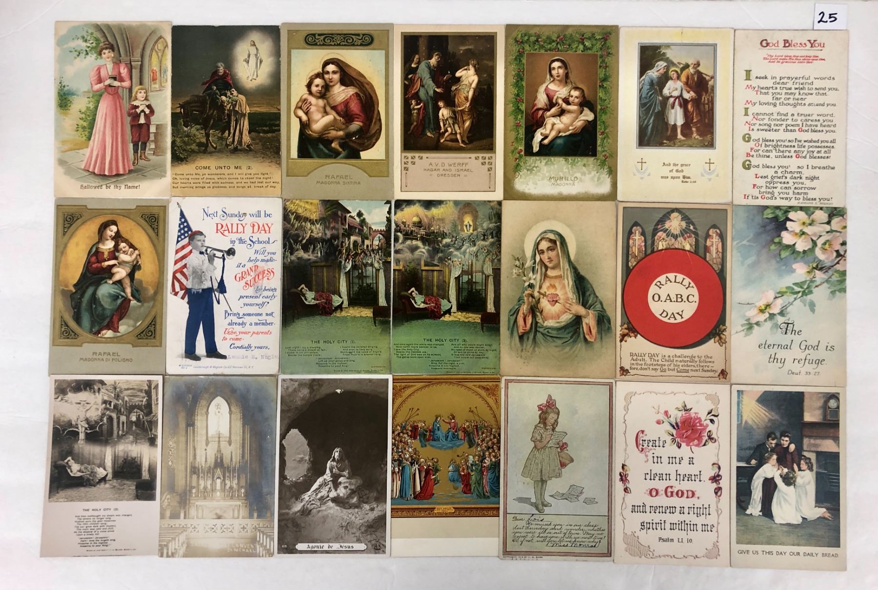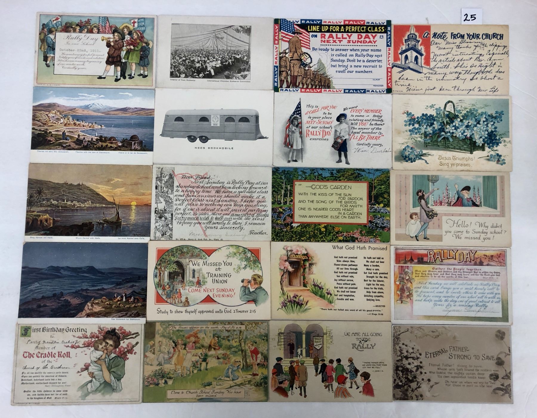 Approx. 125 religious postcards. Rally Day, churches, real photos, etc.