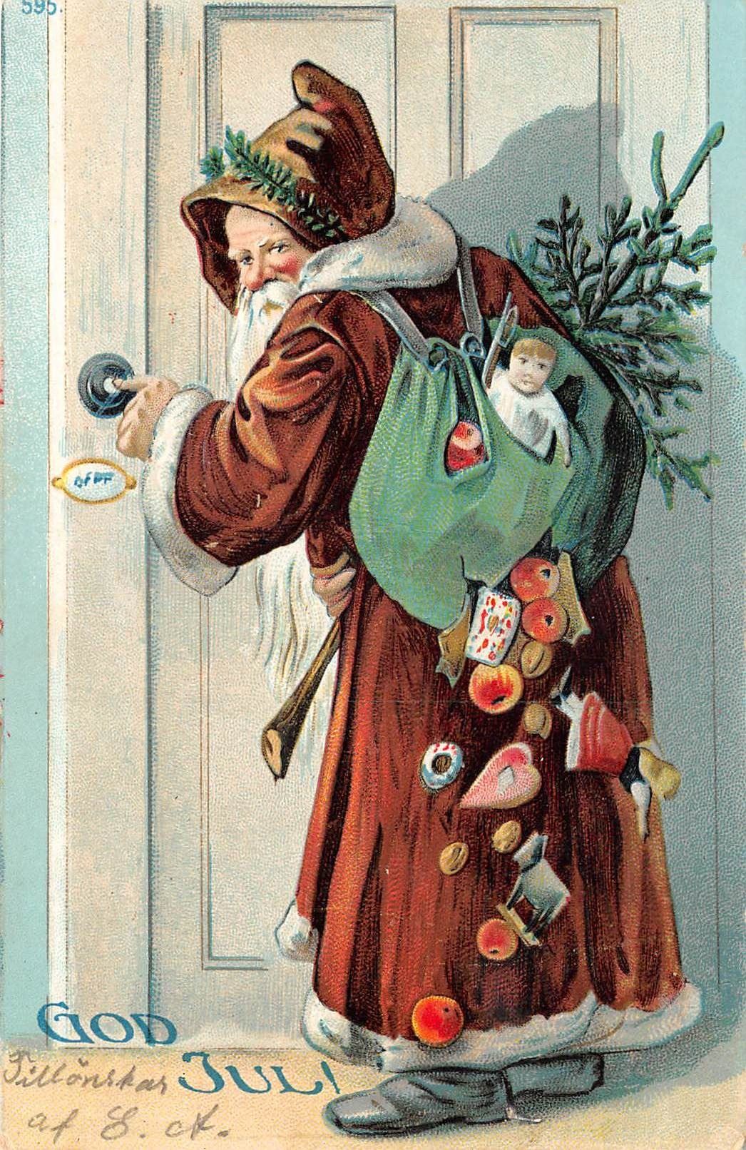 Santa Claus Ringing Door Bell Holiday Christmas Postcard