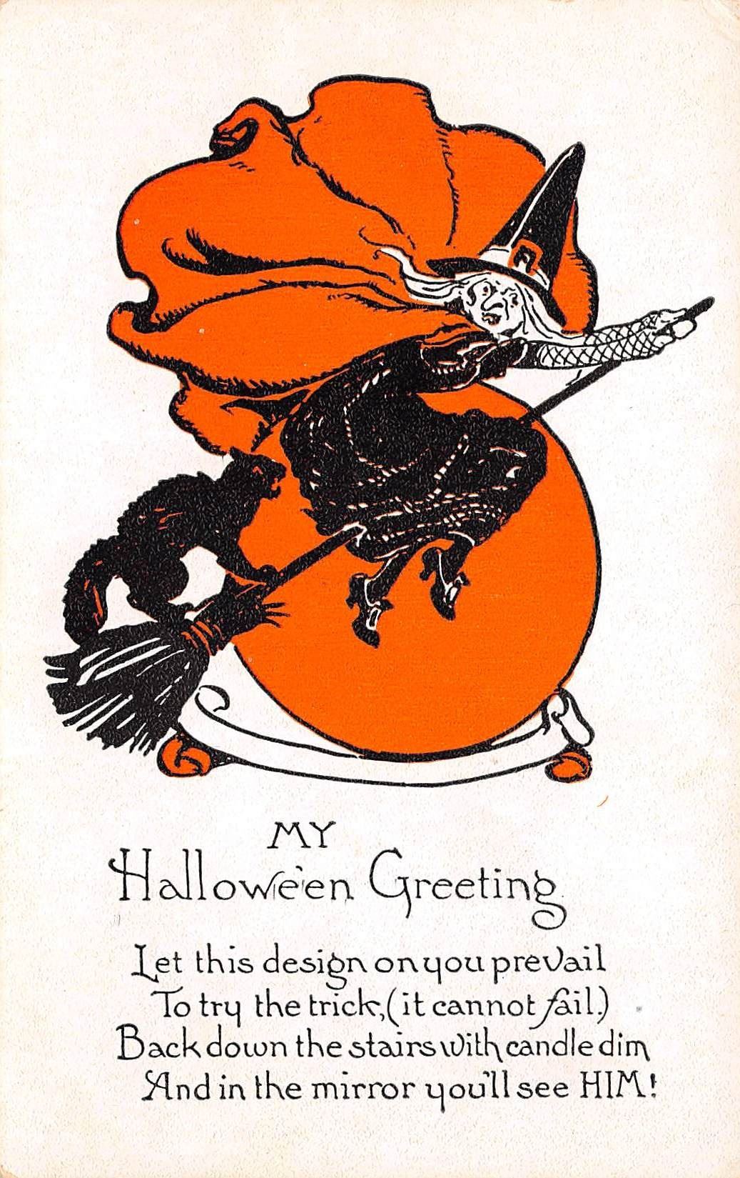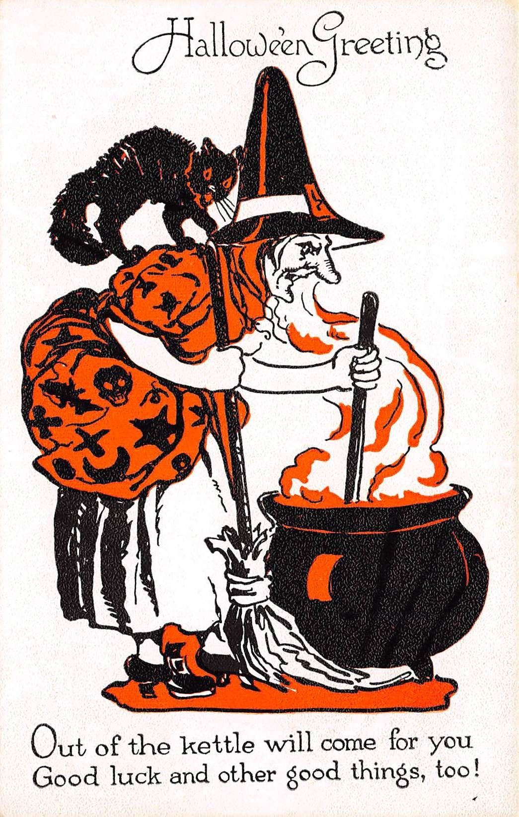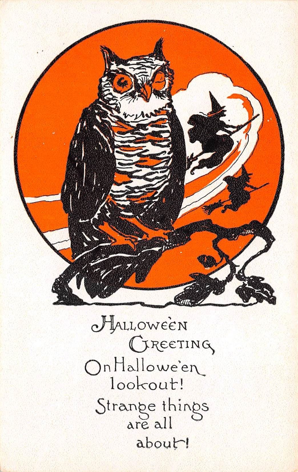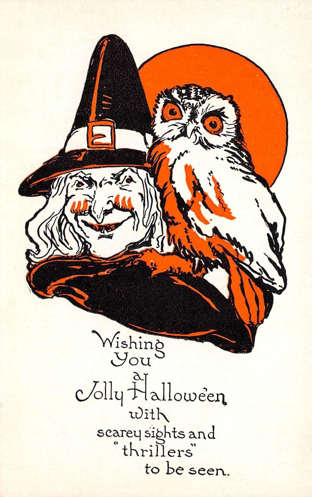 Early. White, black and orange coloring. Witches, owls, cats, etc.