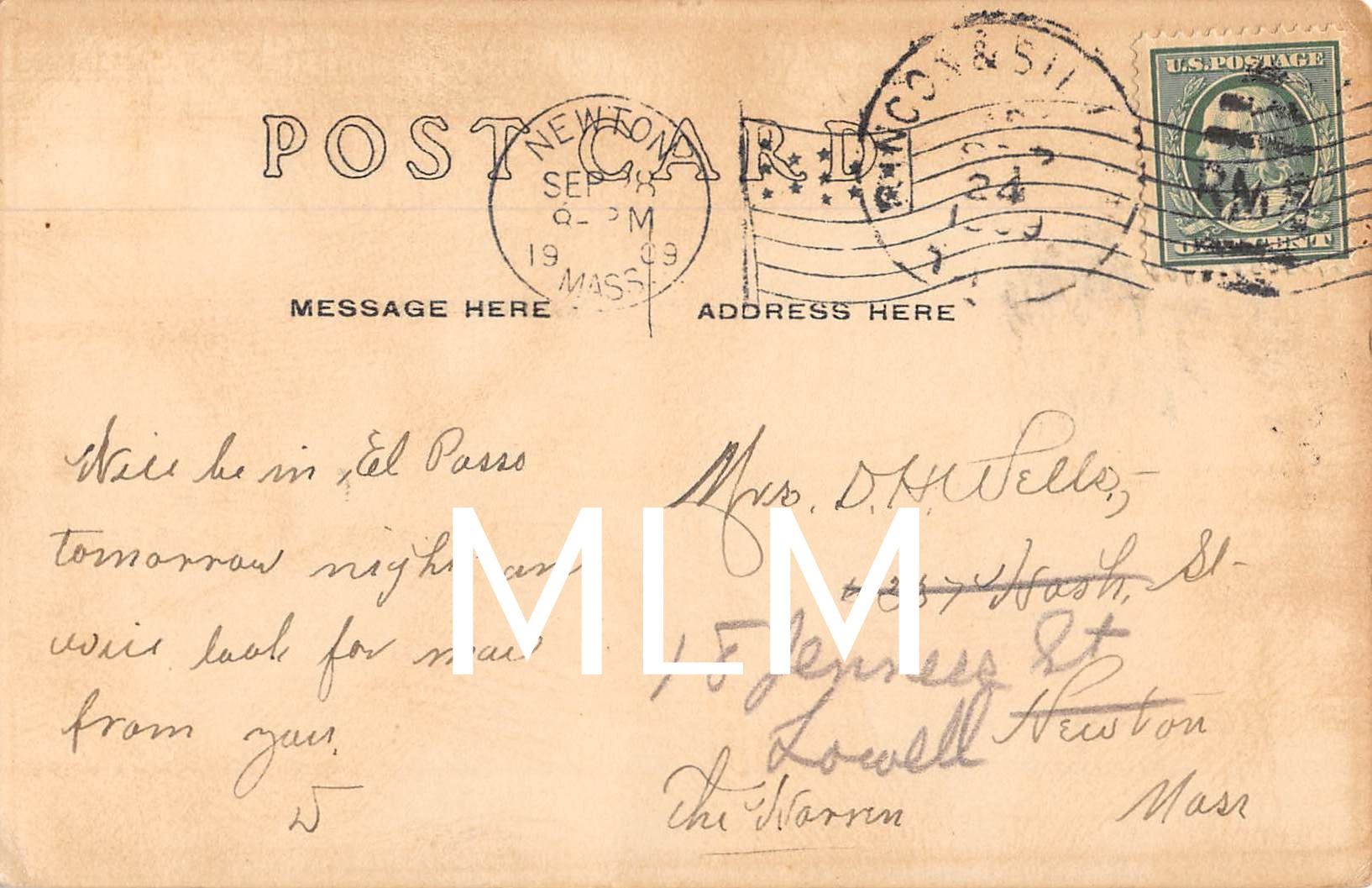 Postmarked 1909. Upper left corner has small wear.