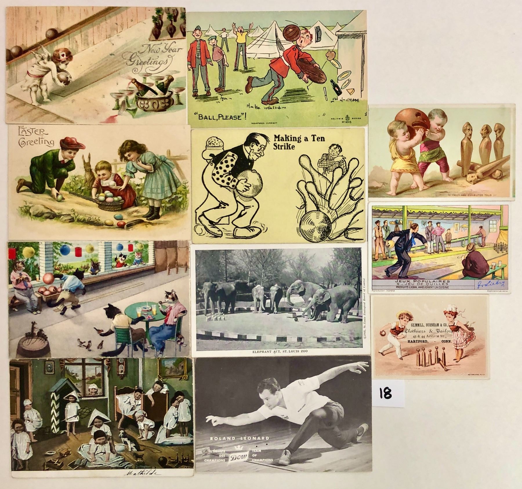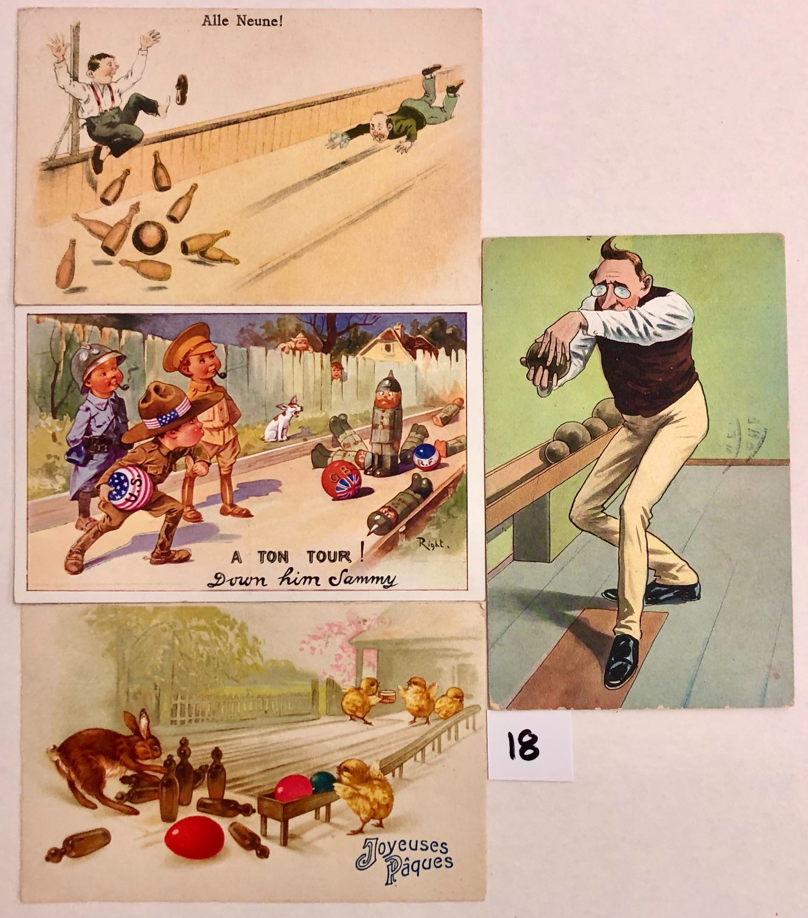 17 bowling greeting type postcards (a few trade cards).