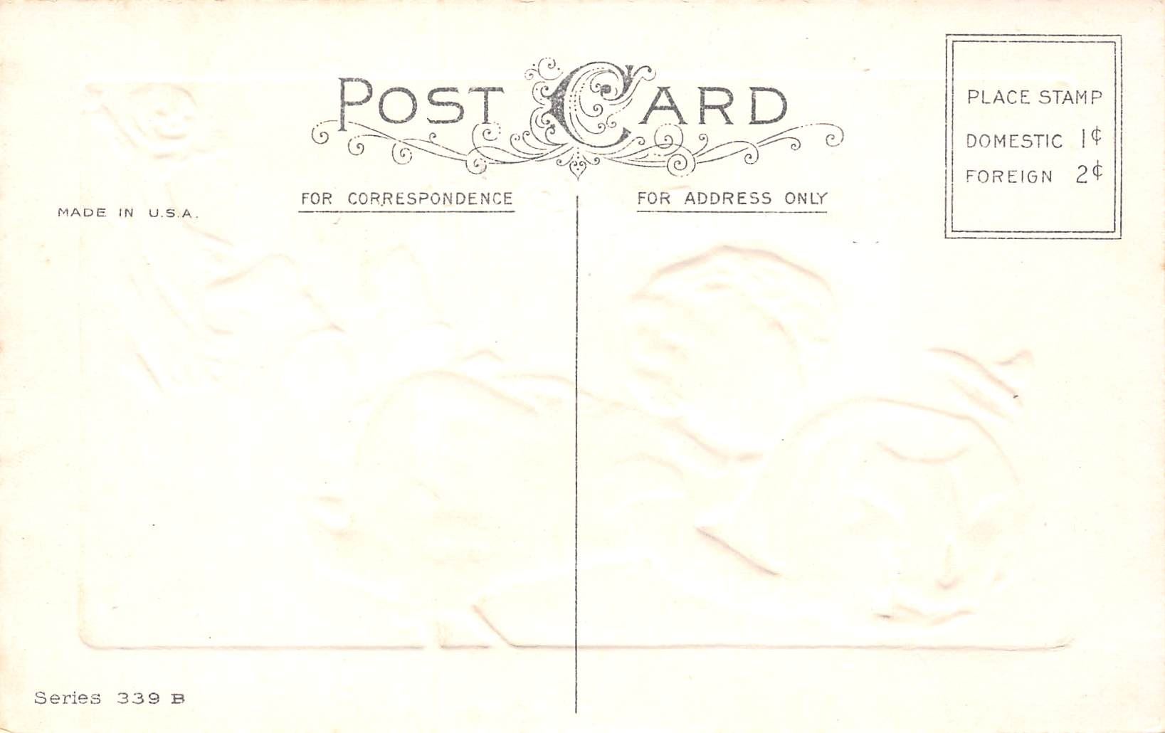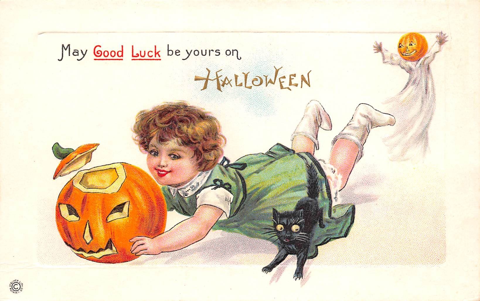 Stetcher Halloween Girl with Jack-O-Lantern, Black Cat & Ghost Postcard