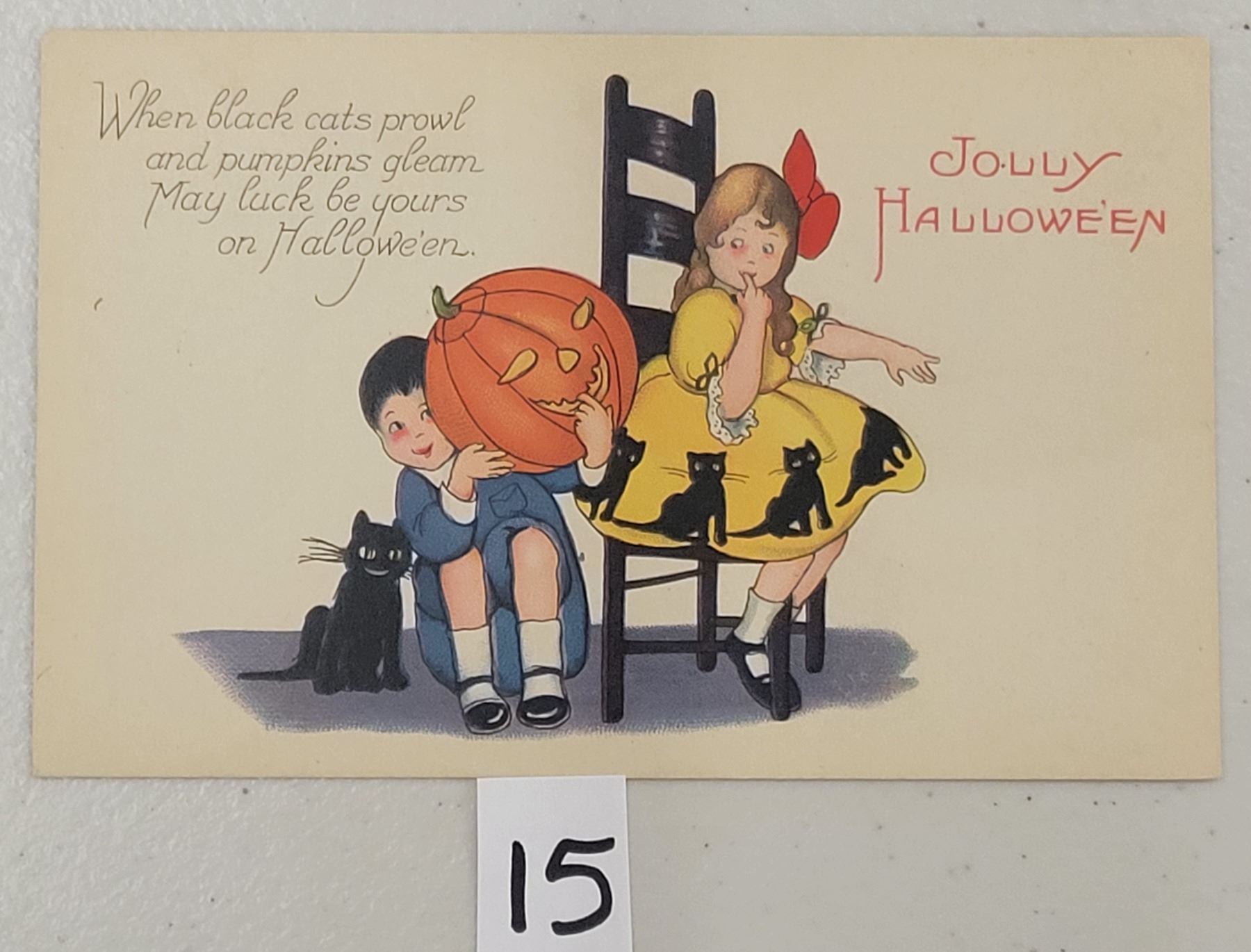 Stetcher Jolly Halloween Boy & Girl With Pumpkin & Cat Postcard
