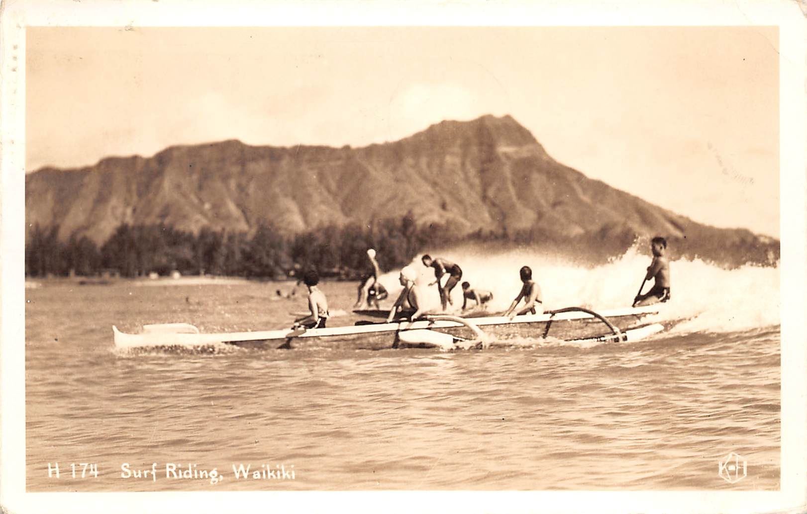 Surf Riding, Waikiki Diamond Head in Background Photo Postcard