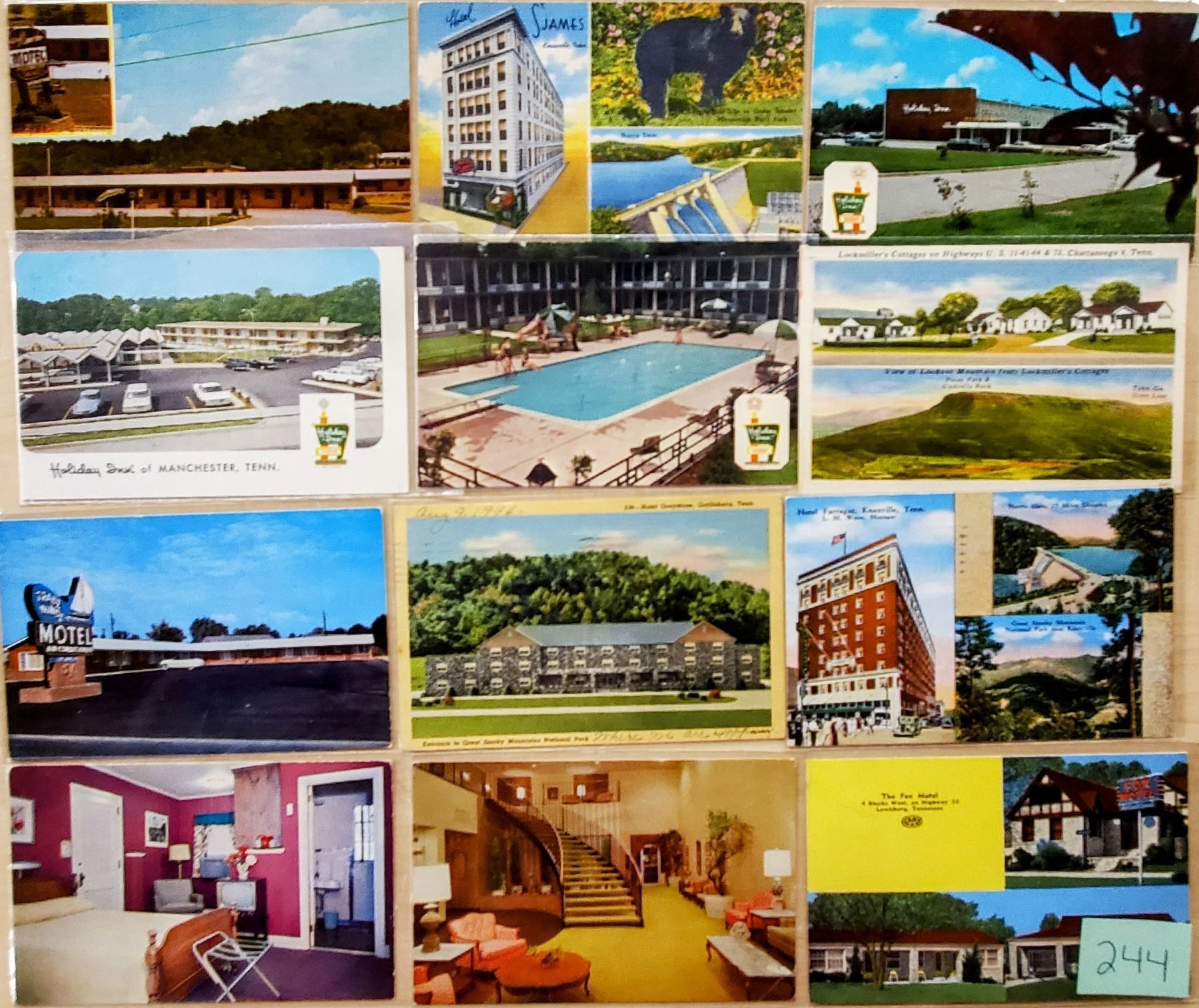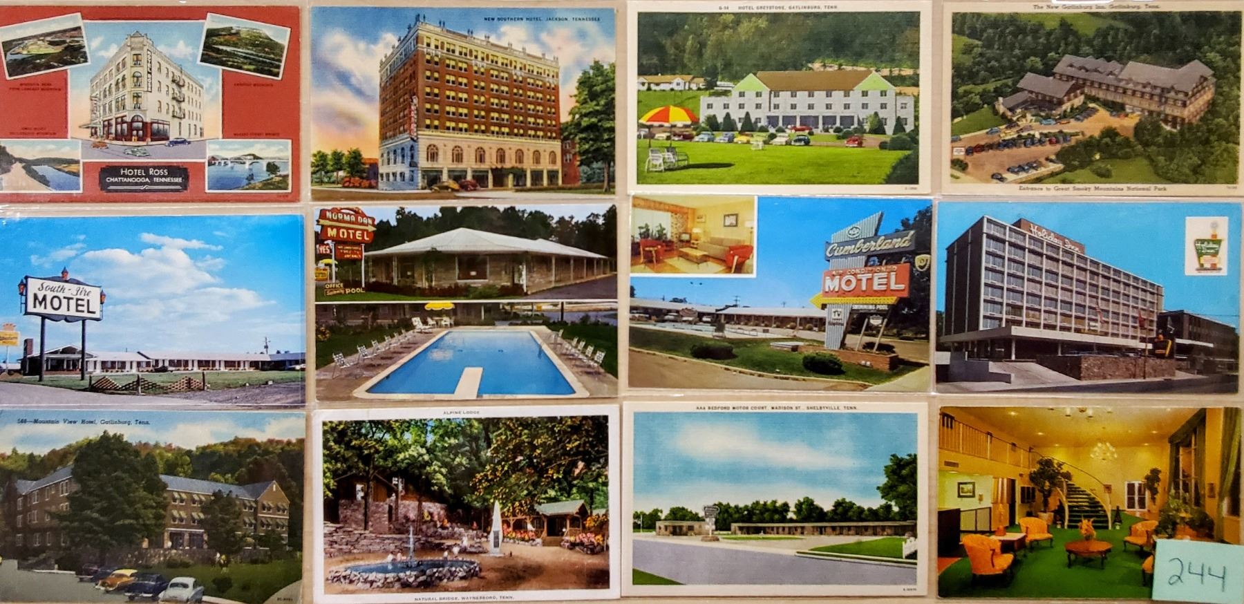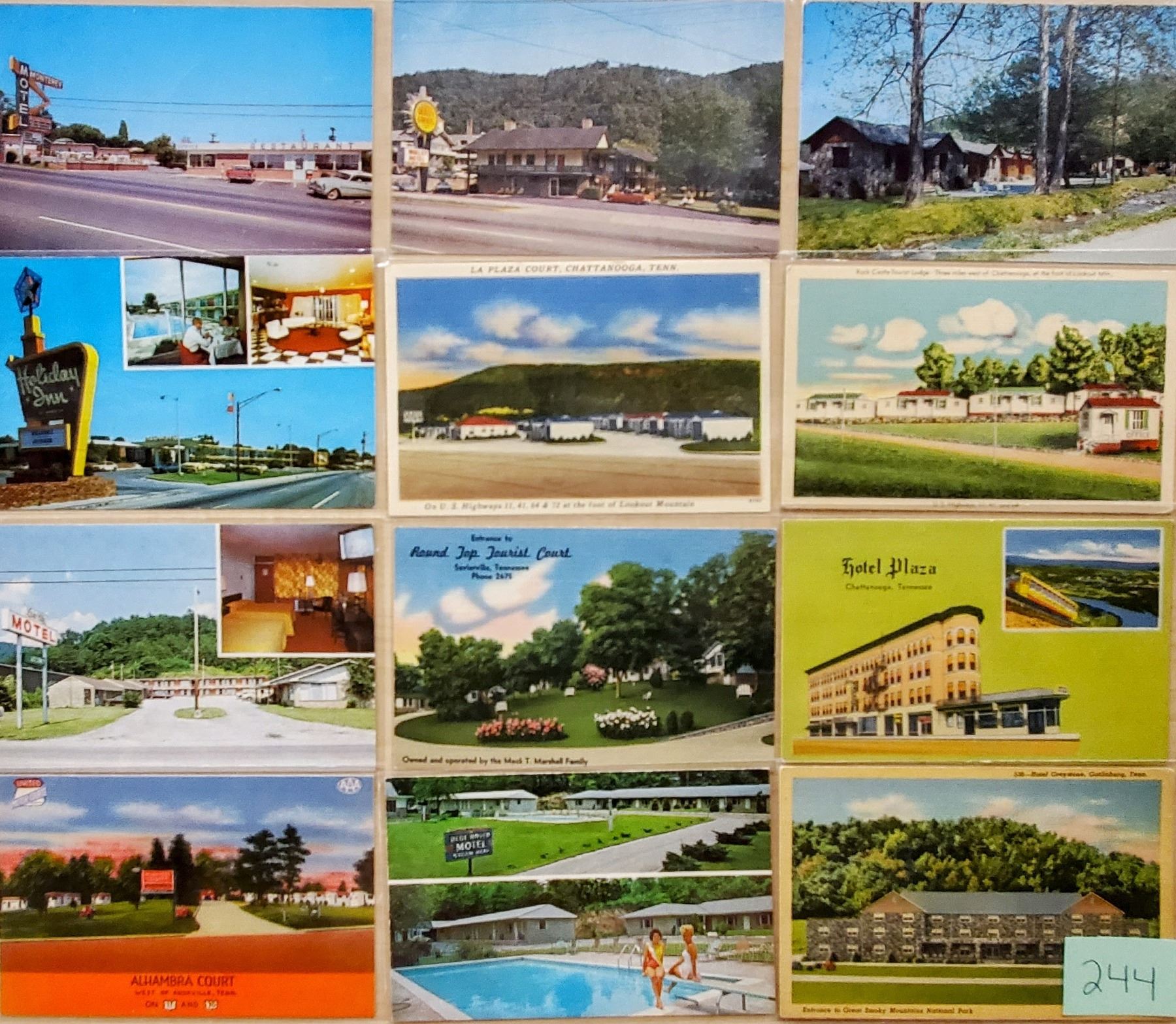 Over 50 Tennesse postcards of motels, hotels, restaurants. Linen to standard size chrome.