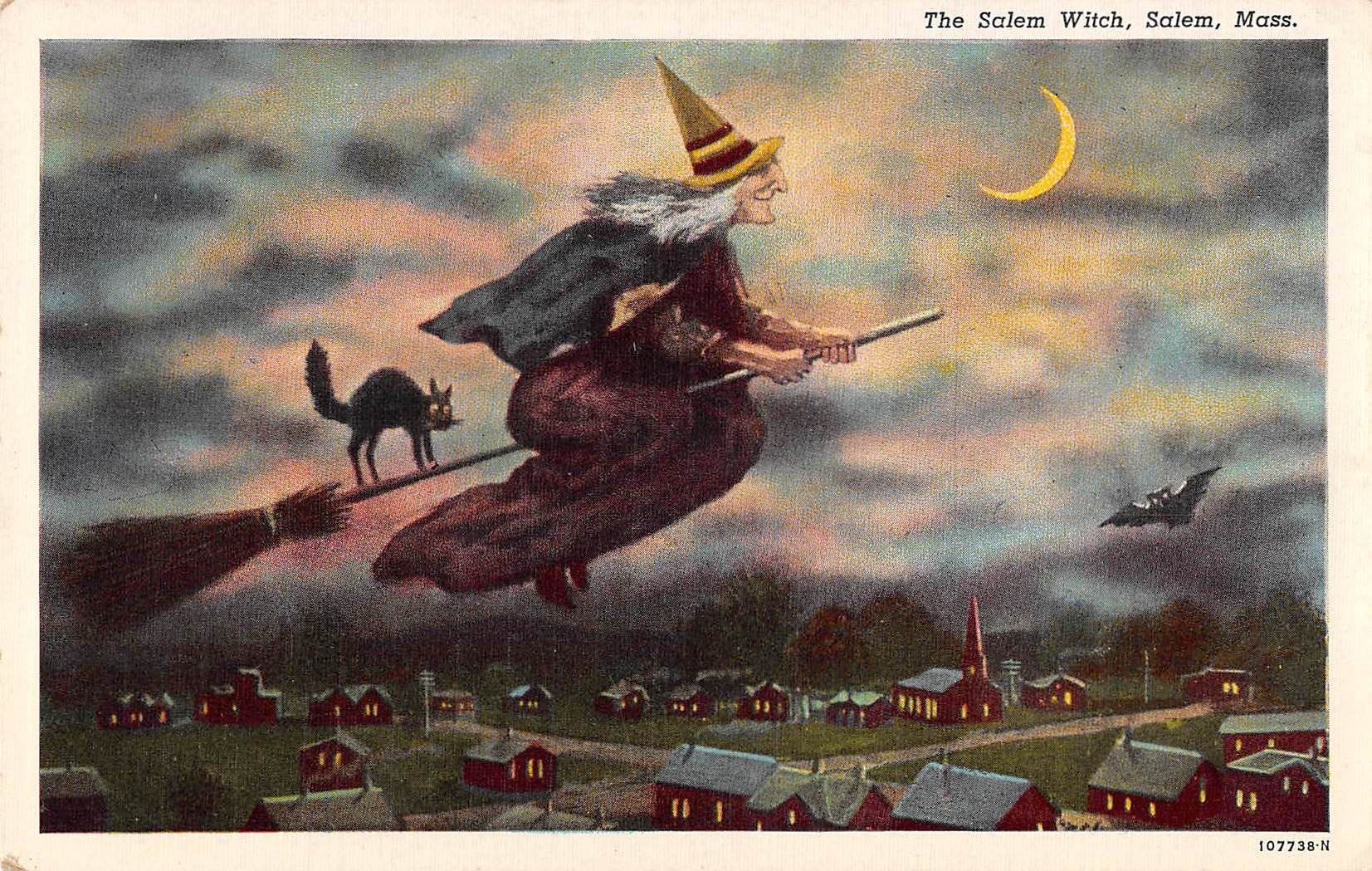 The Salem Witch, Salem, Mass. On Broom & Cat Under The Moon Postcard
