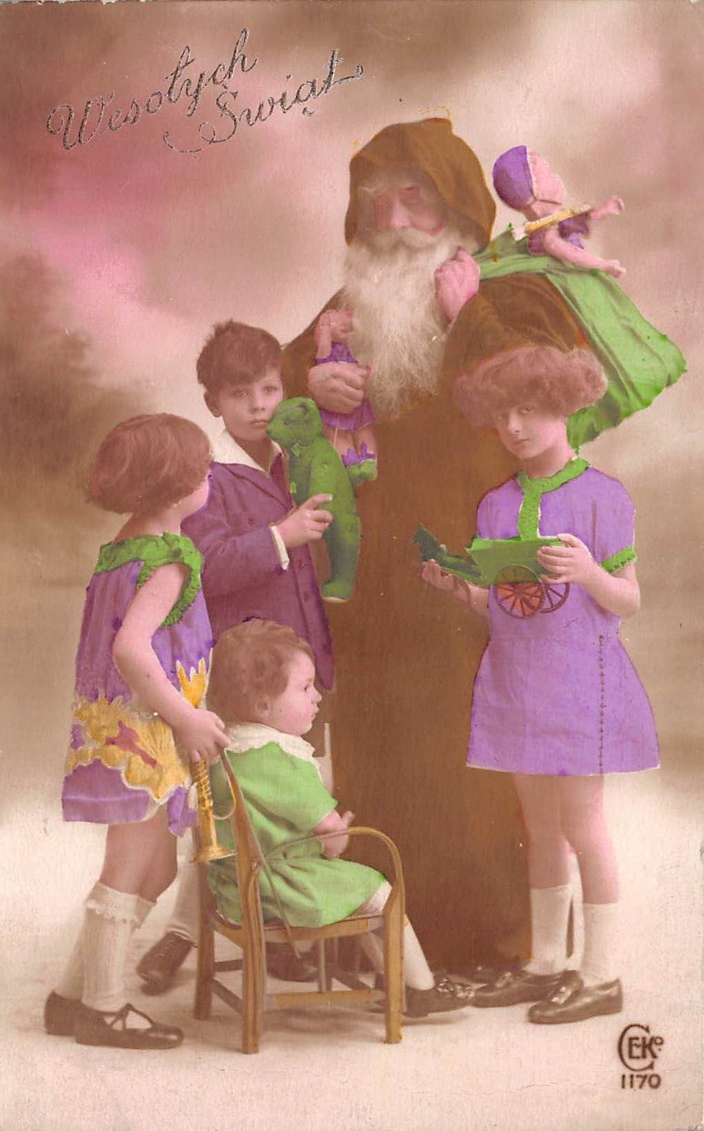 Tinted Real Photo Santa Claus with Children & Toys Postcard