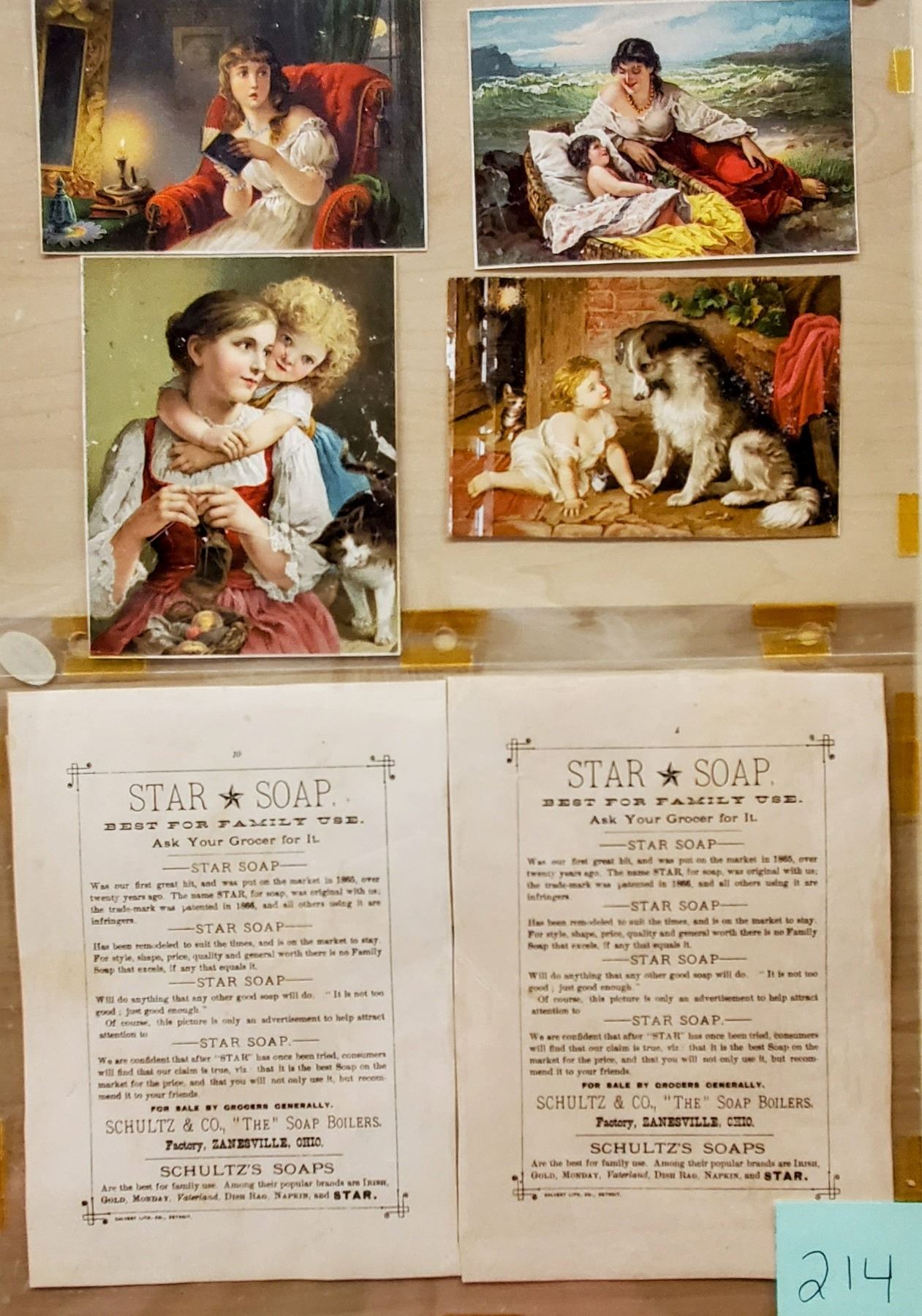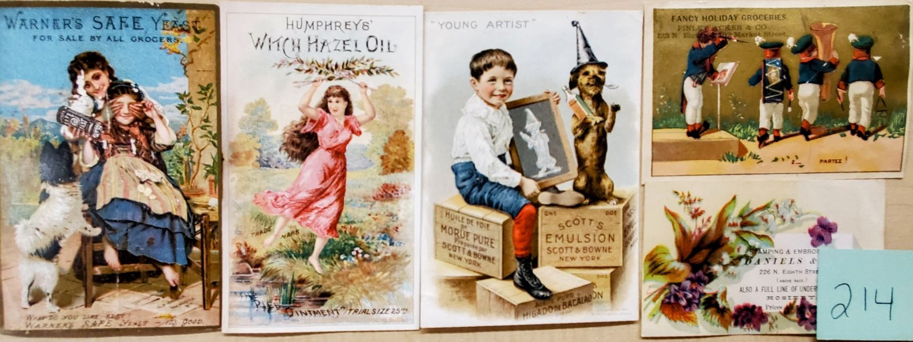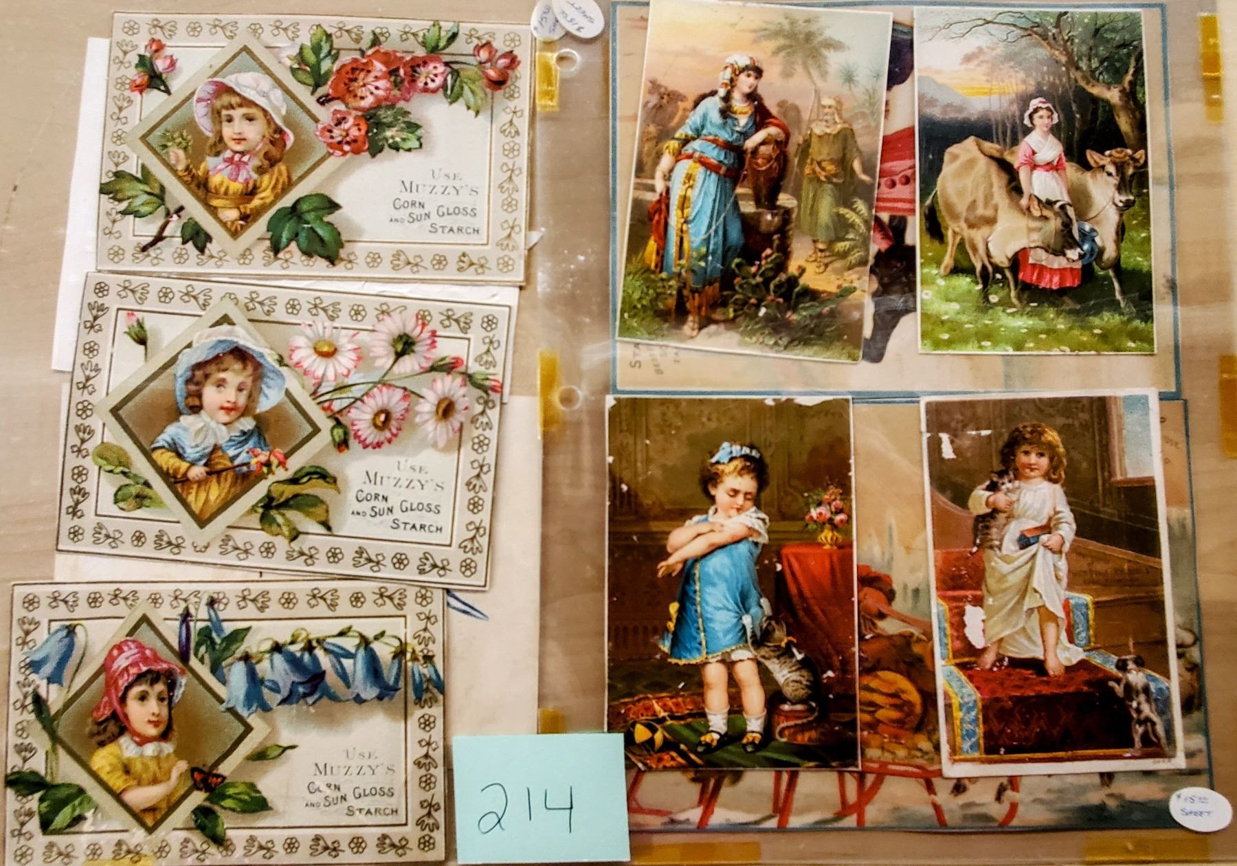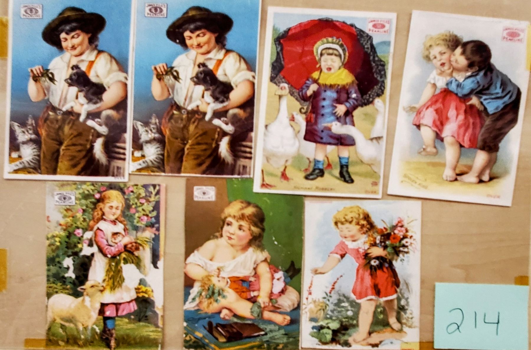 Album of over 175 trade cards. Different sizes. Children, tea, thread, animals, etc.