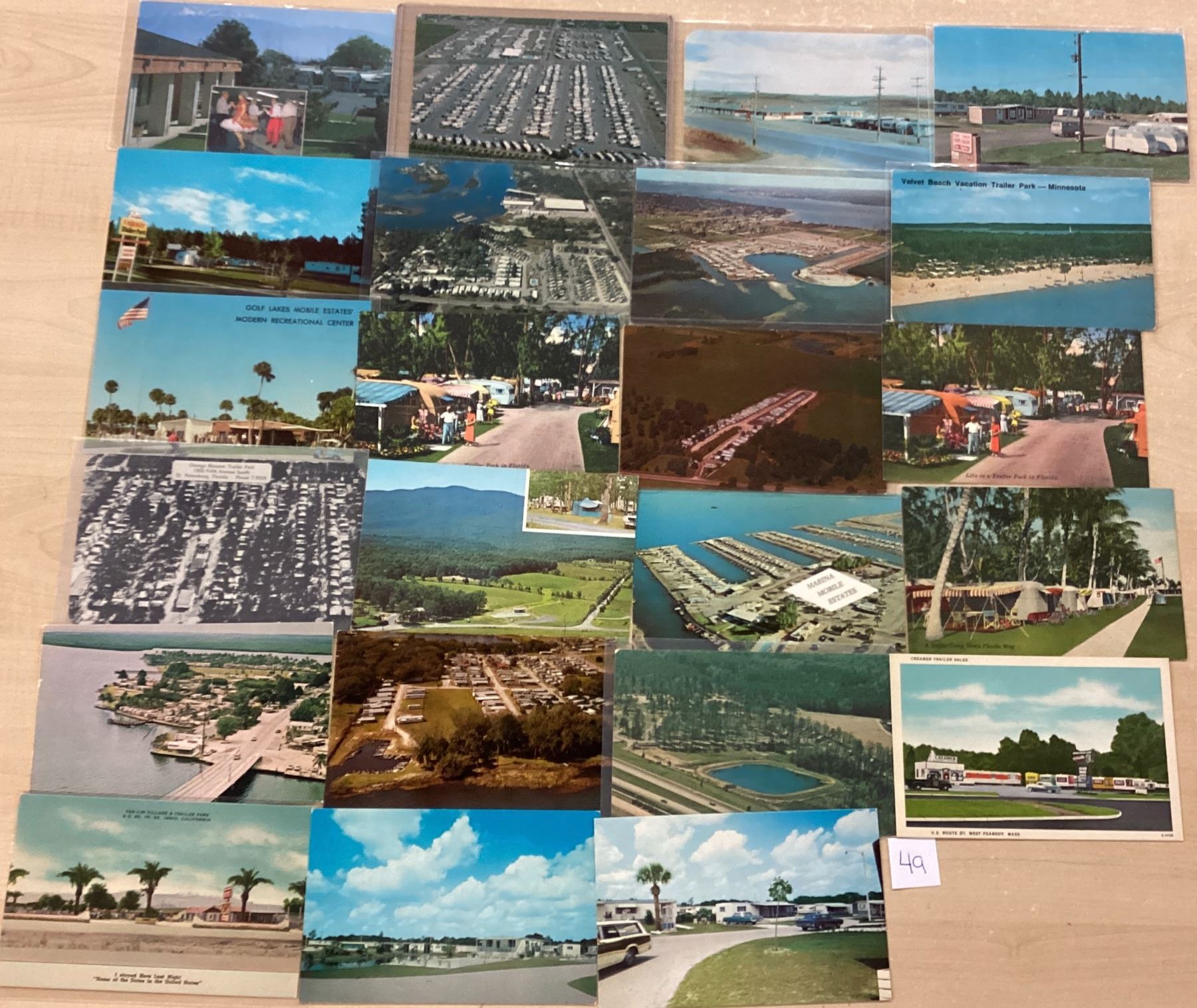 Over 20 trailer park postcards. Linen to standard size chrome.