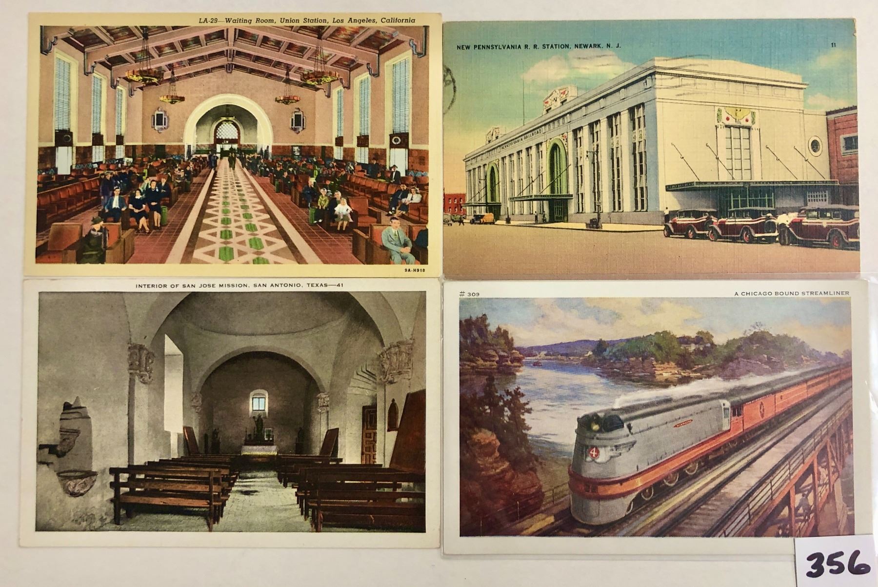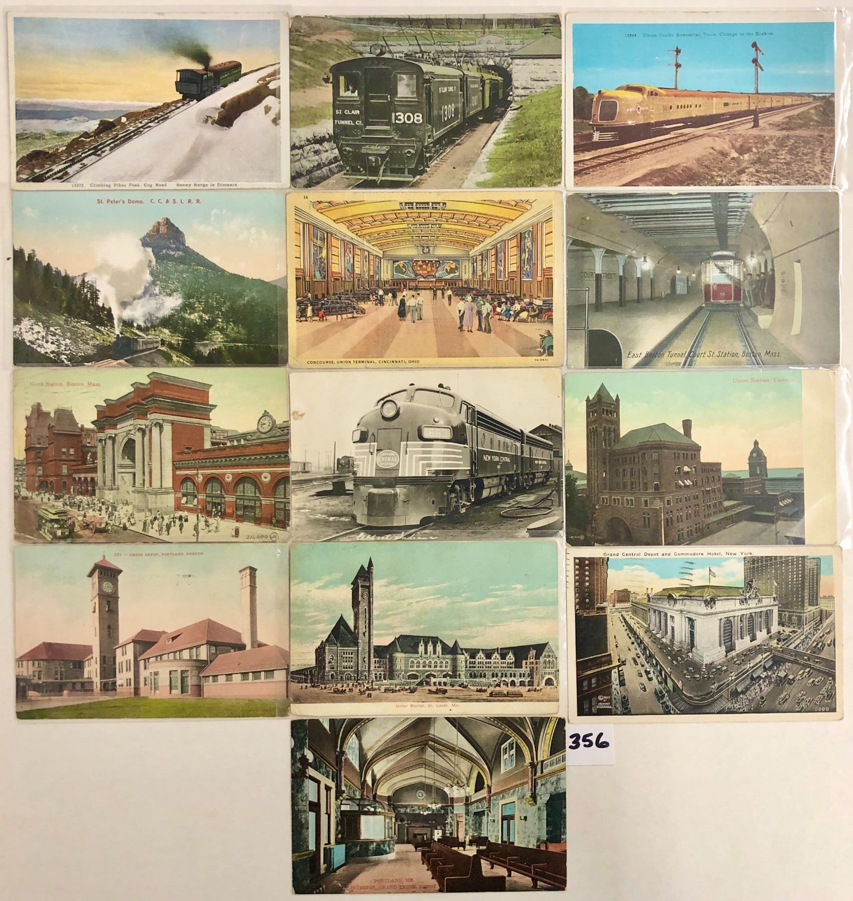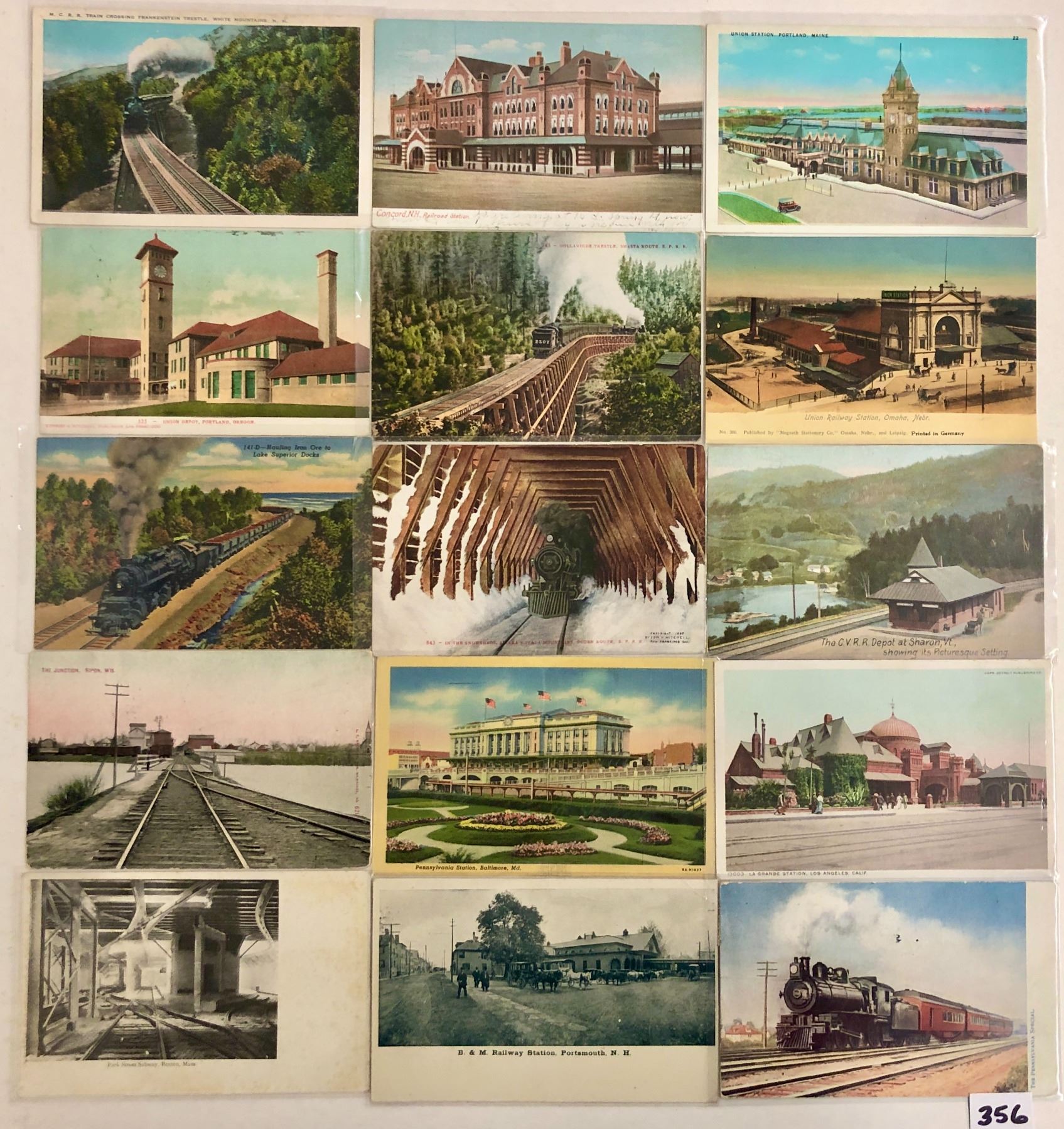 Over 100 train and related. Early to linen. Railroad, depots, etc.