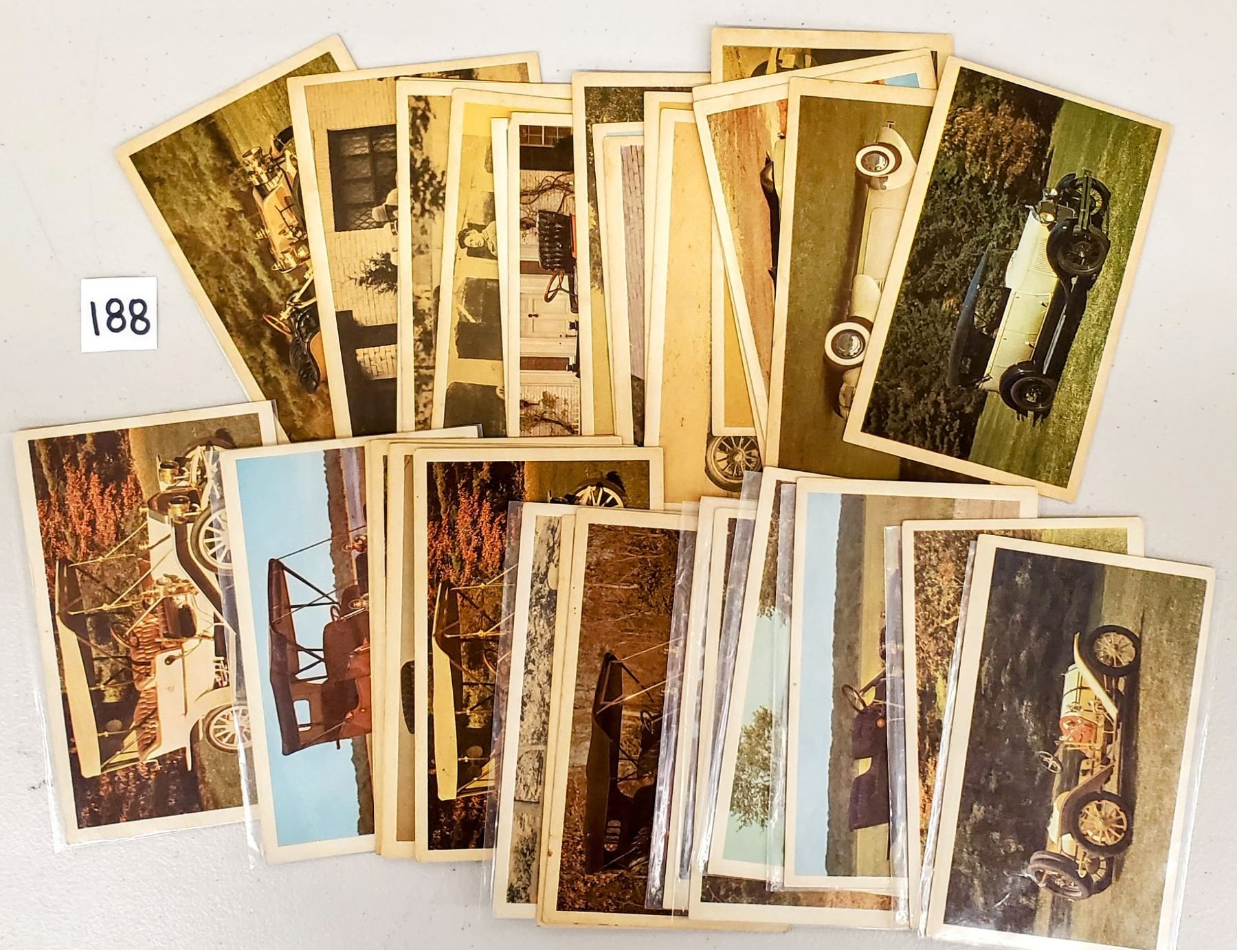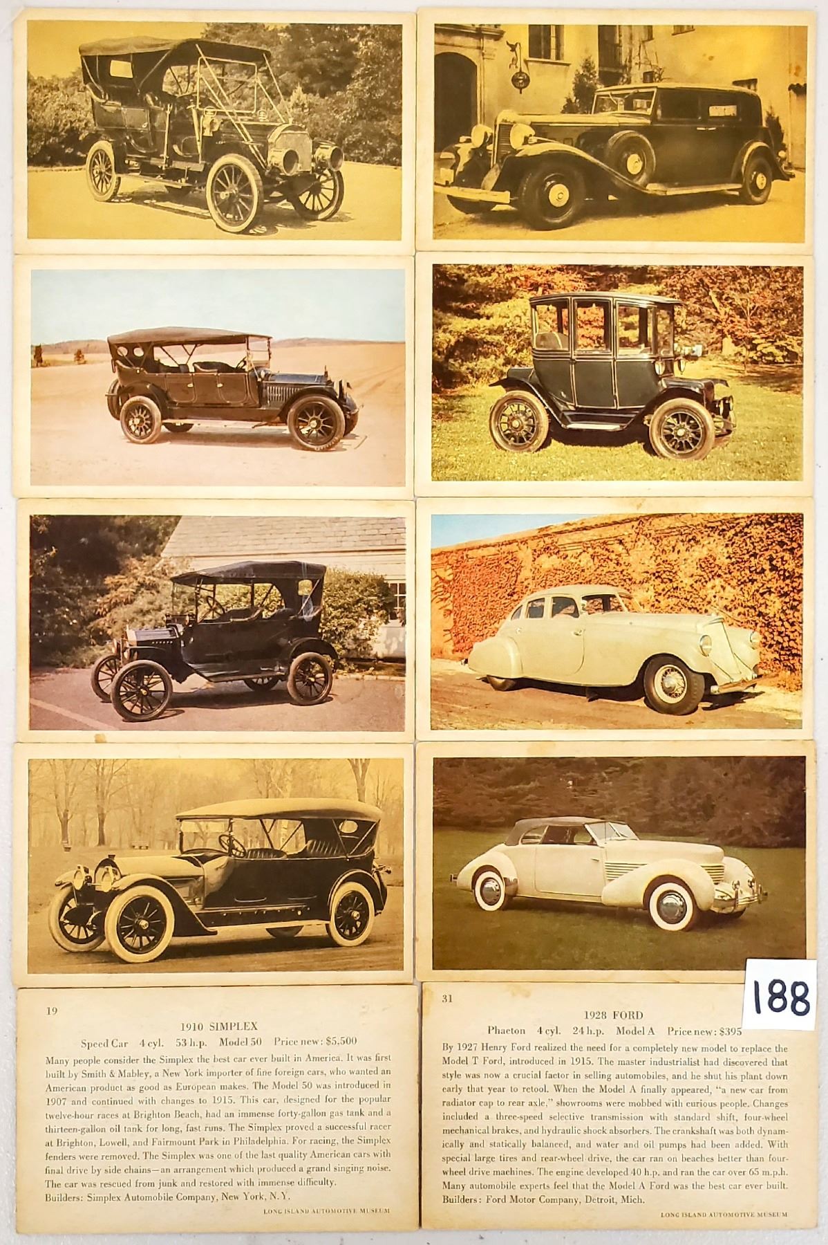 Over 30 early auto. Mostly non postcards with information about the antique auto on back. Long Island Auto Muesum.