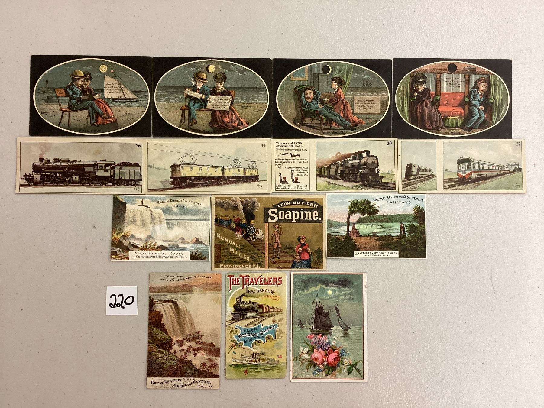 14 early trade cards. Mostly relating to railroad, a few do not.
