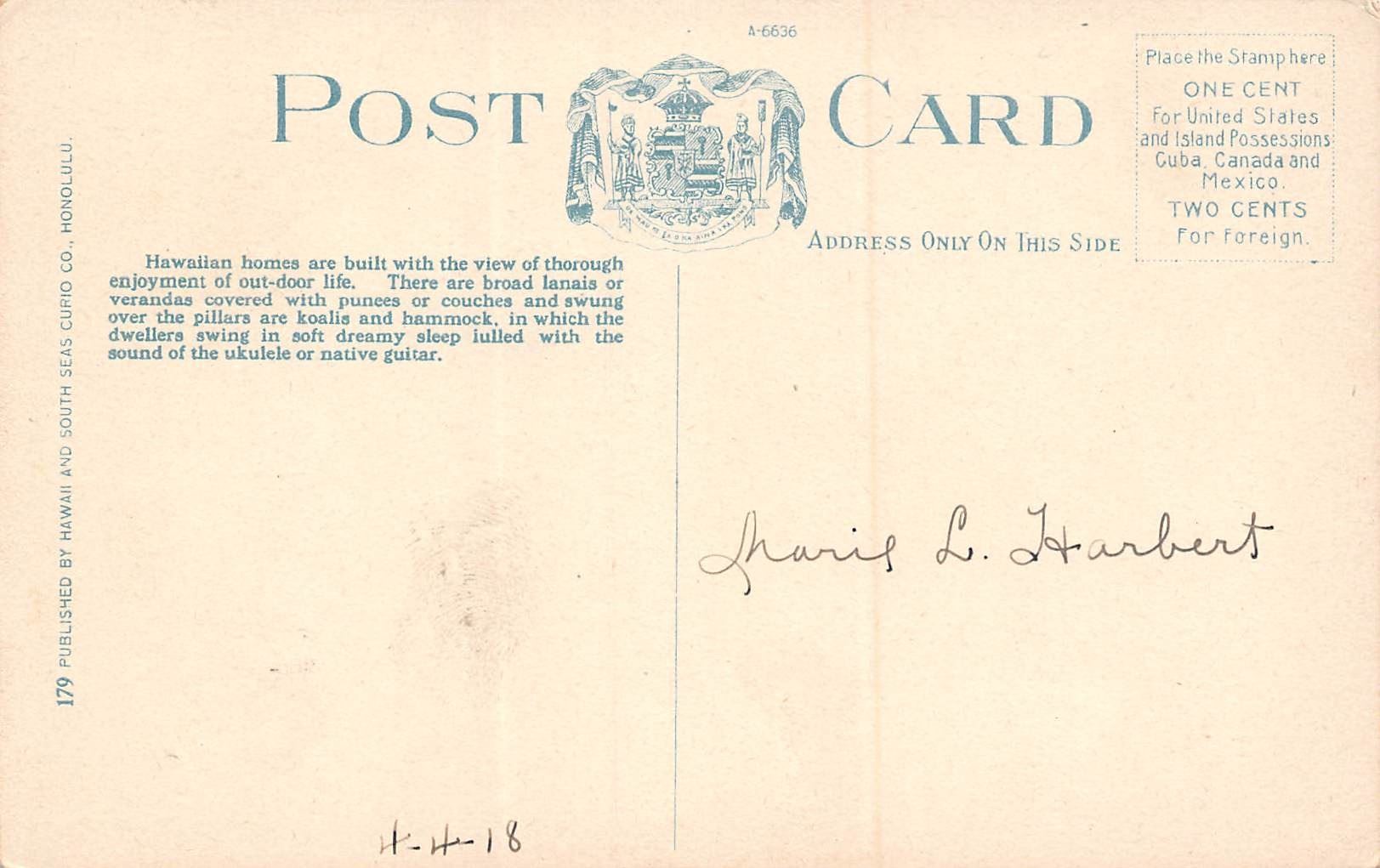 Over 100 years old. No. 179 by Hawaii & South Seas Curio Co. Unused.