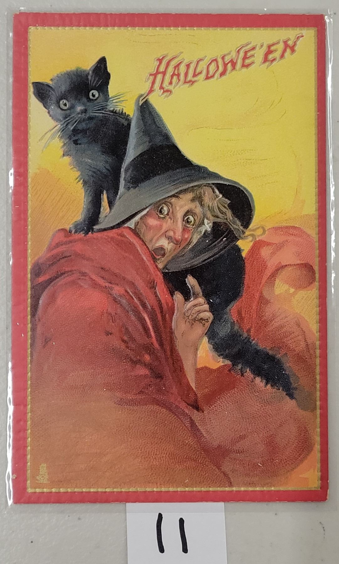 Tuck Brundage Red Border Witch & Black Cat Halloween Postcard