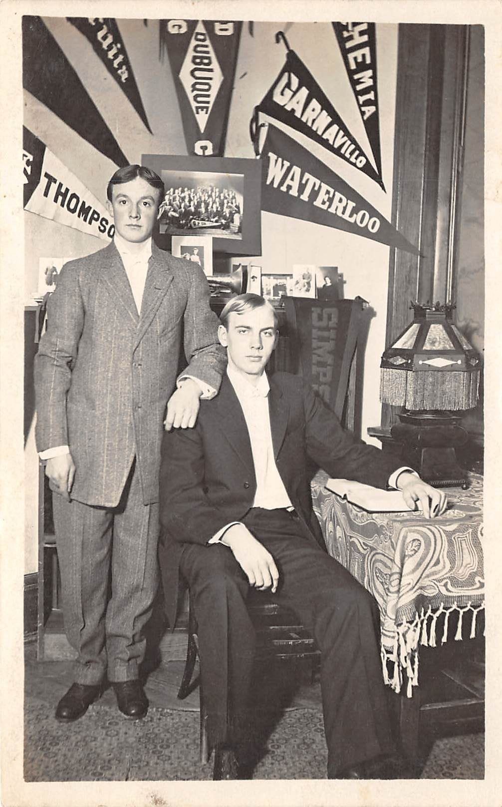 Two Men In Front Of College Photos & Pennants Real Photo Postcard