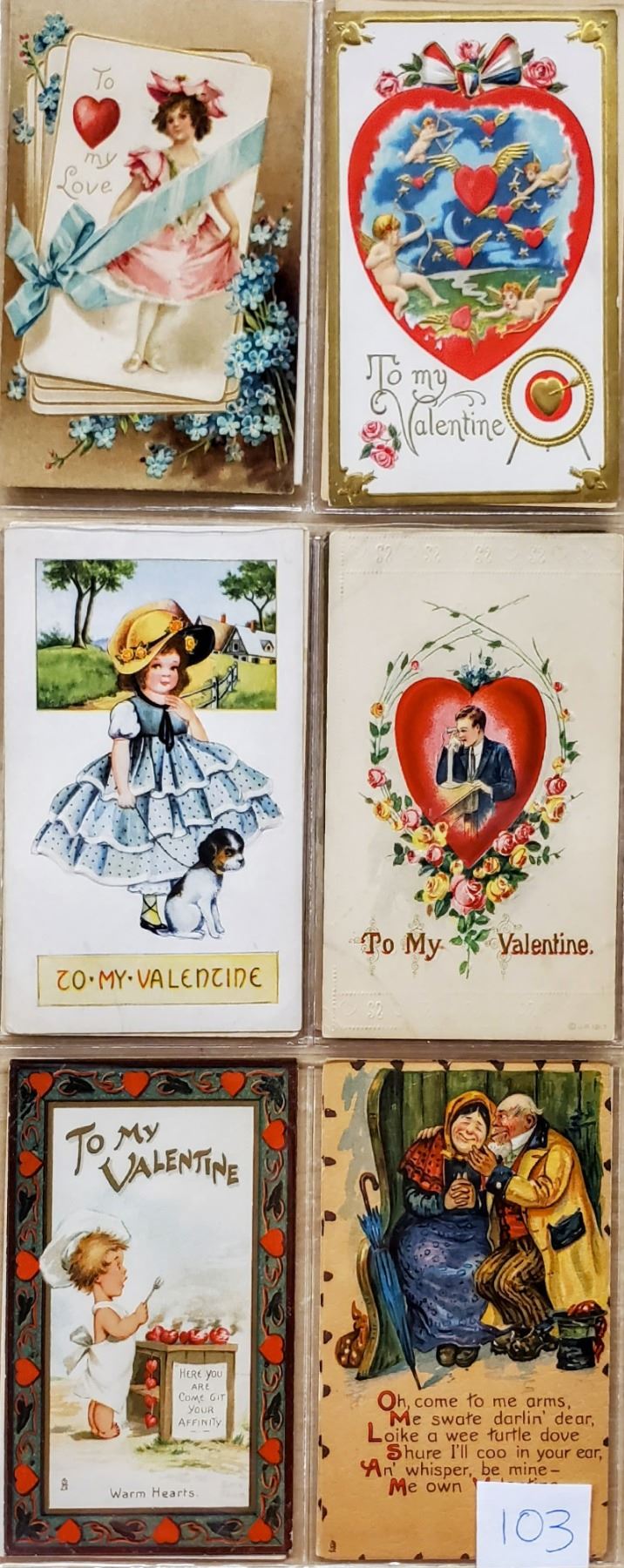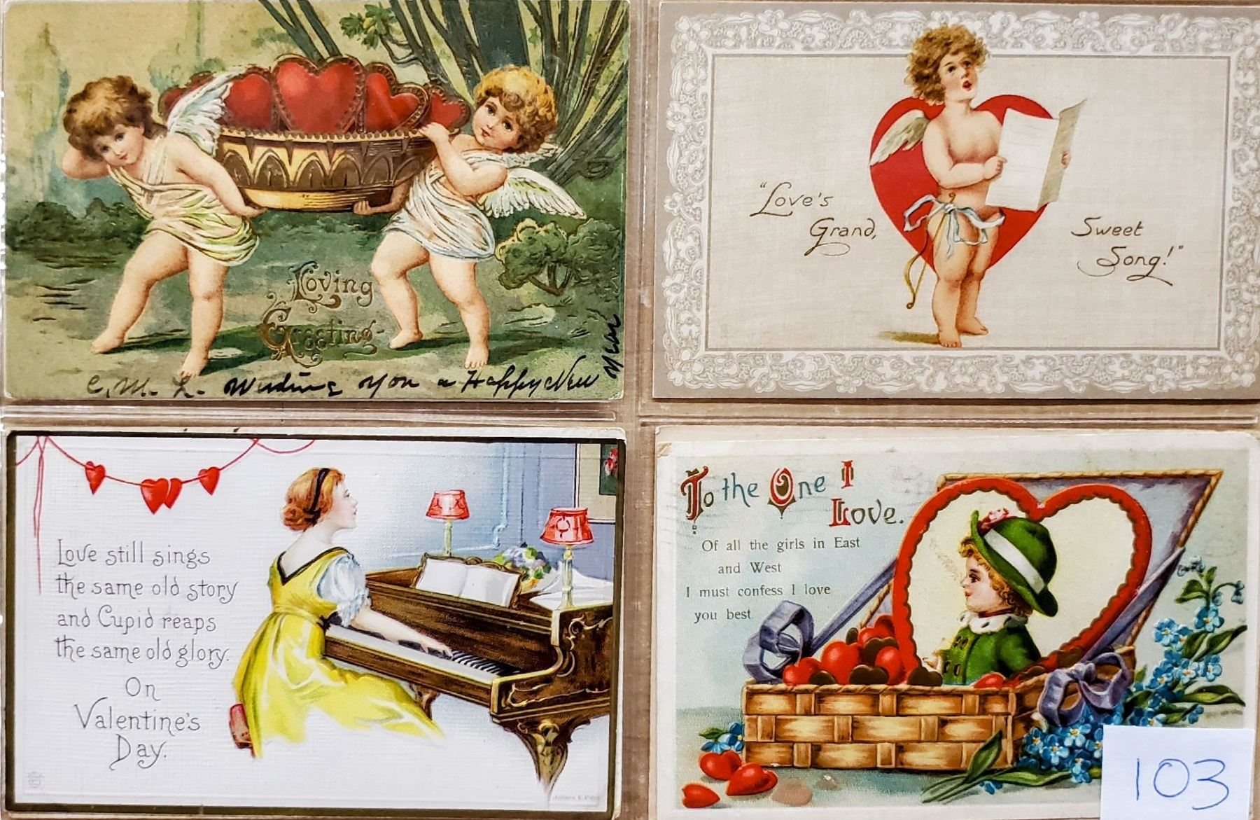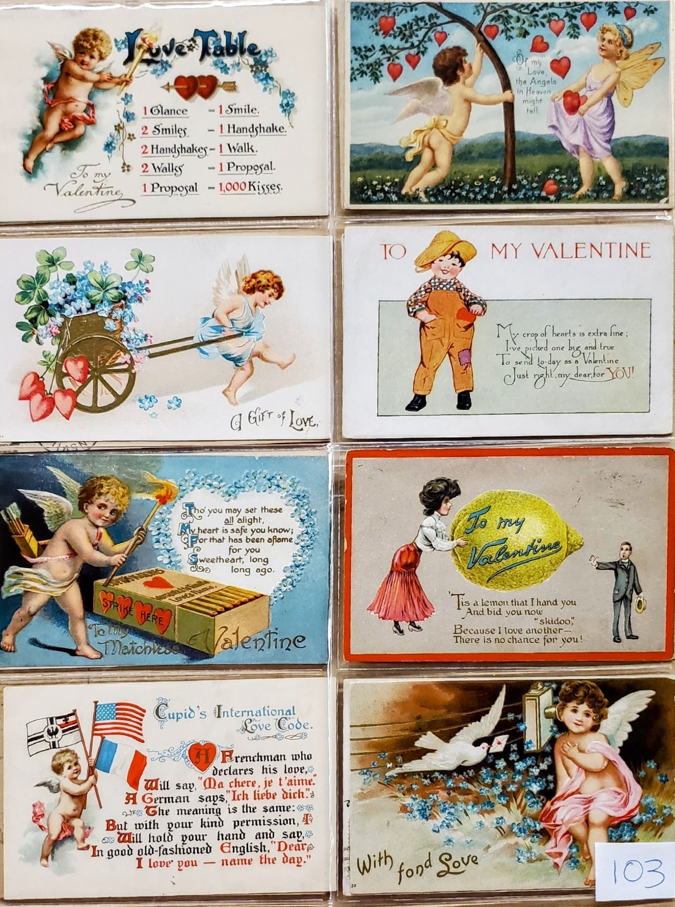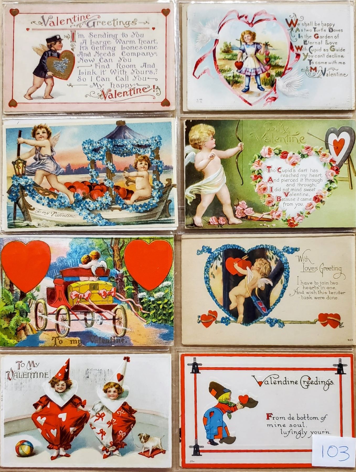 Album of over 85 Valentine's postcards. Artists, publishers, etc. Each card shows at least a child, lady or angel.