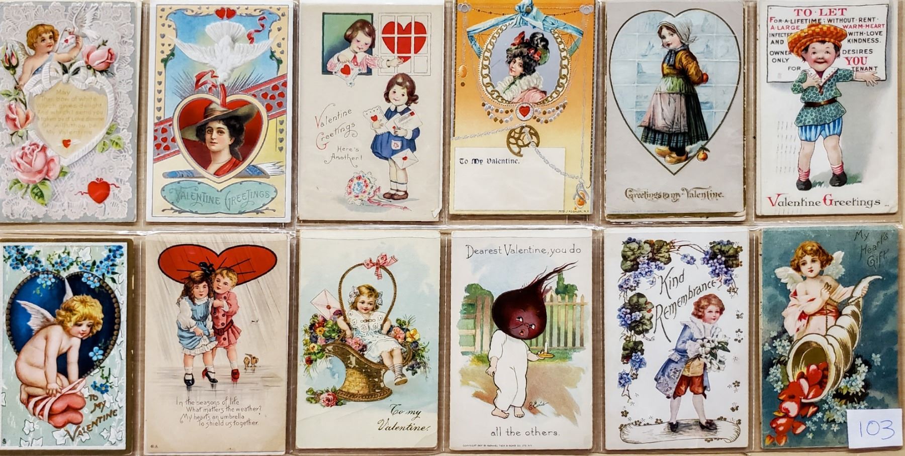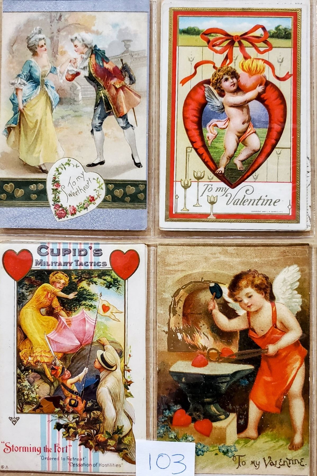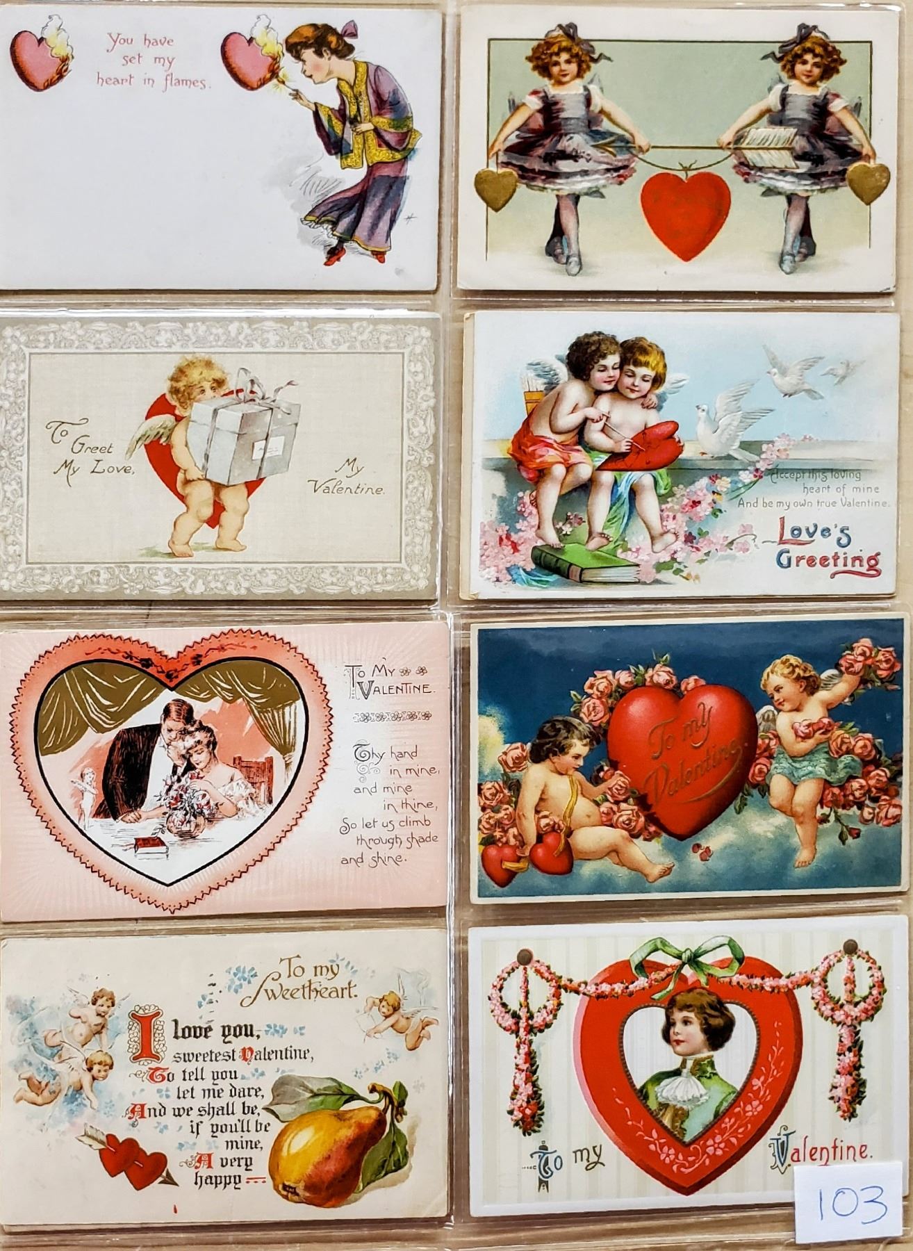 Album of over 85 Valentine's postcards. Artists, publishers, etc. Each card shows at least a child, lady or angel.