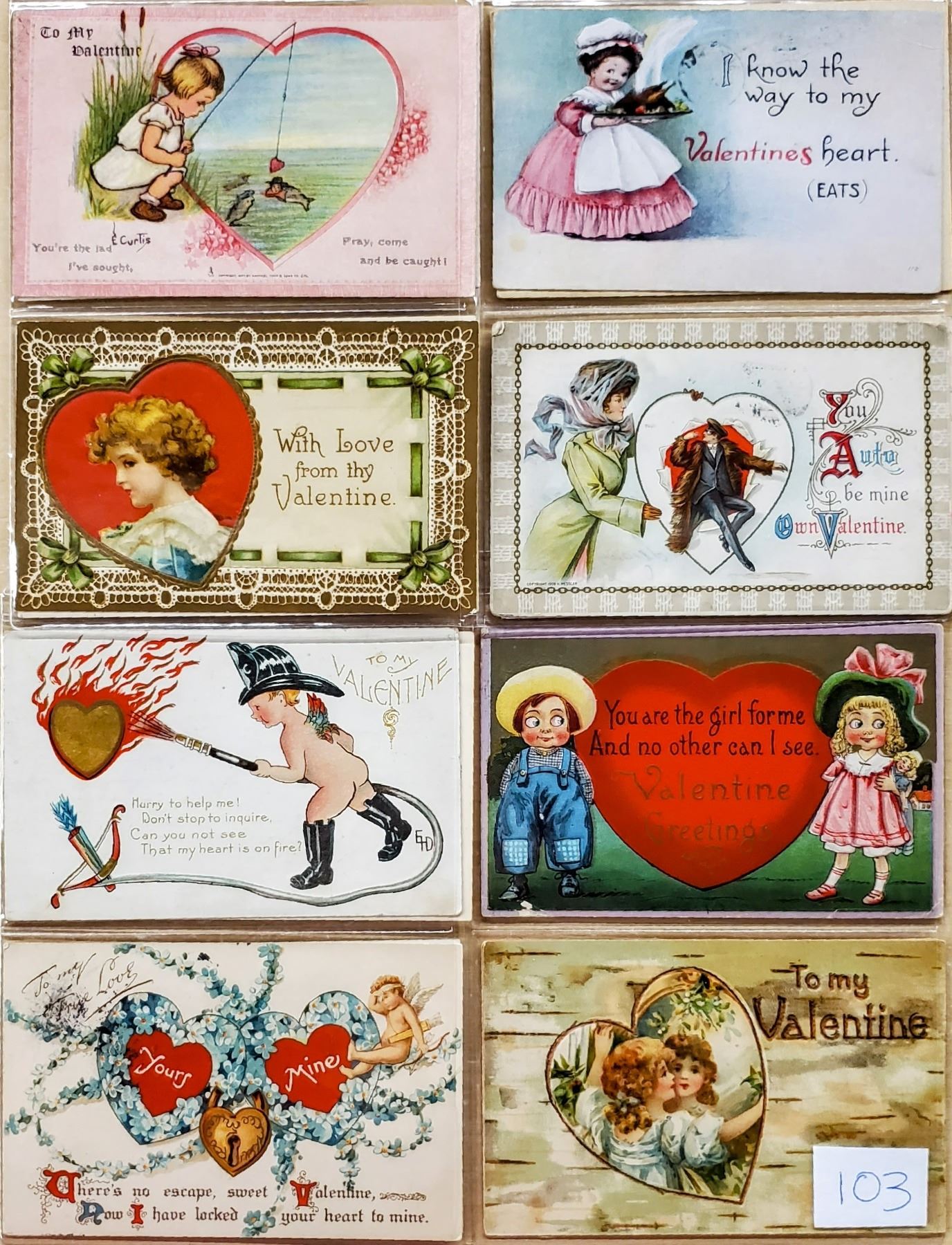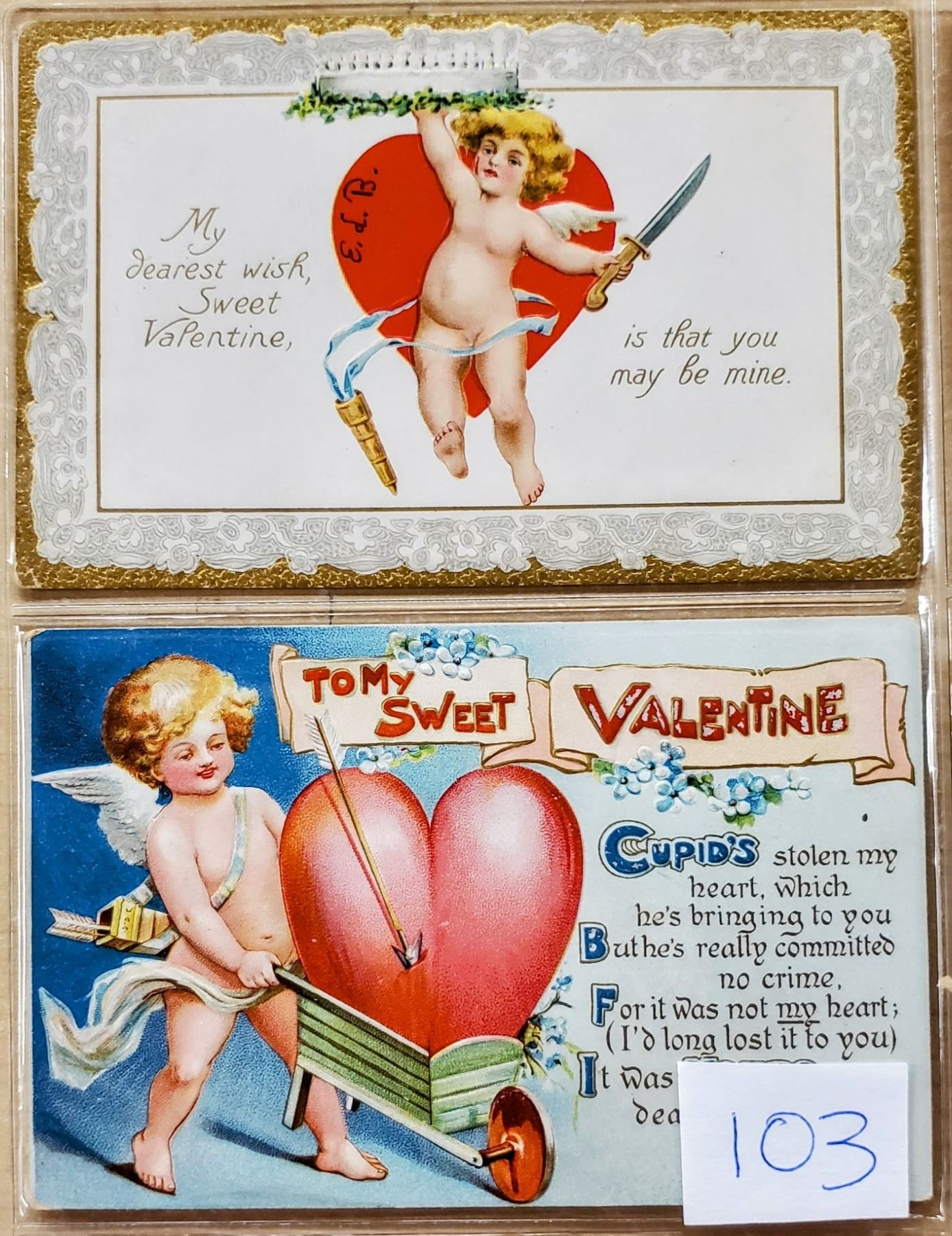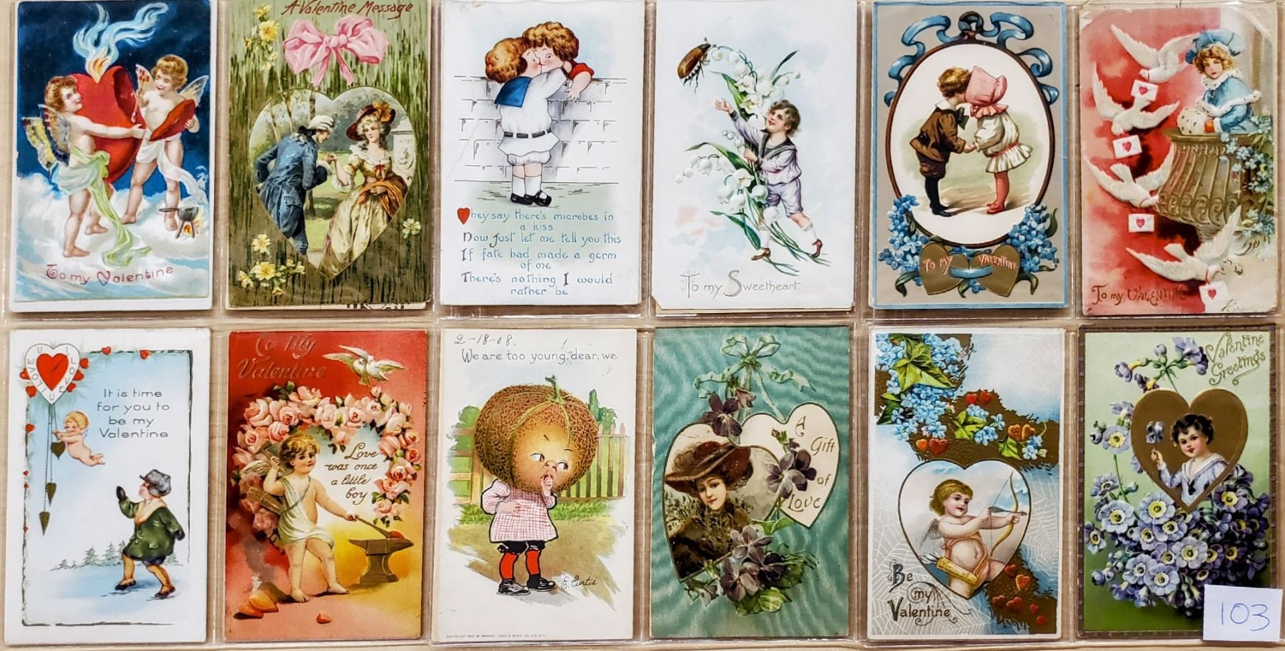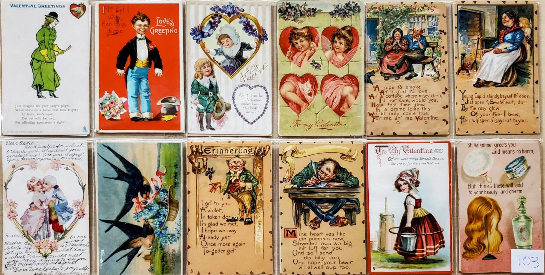 Album of over 85 Valentine's postcards. Artists, publishers, etc. Each card shows at least a child, lady or angel.