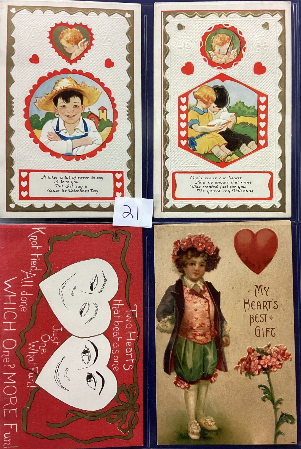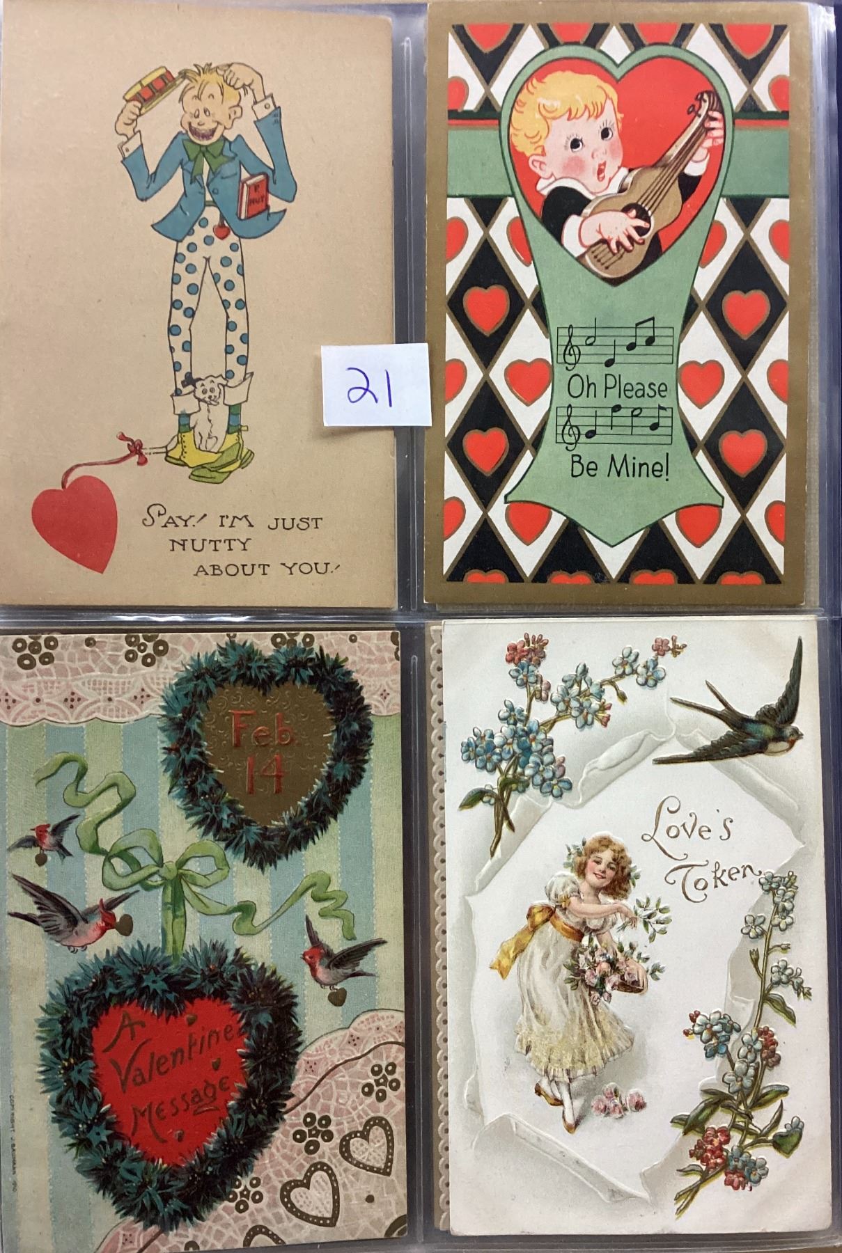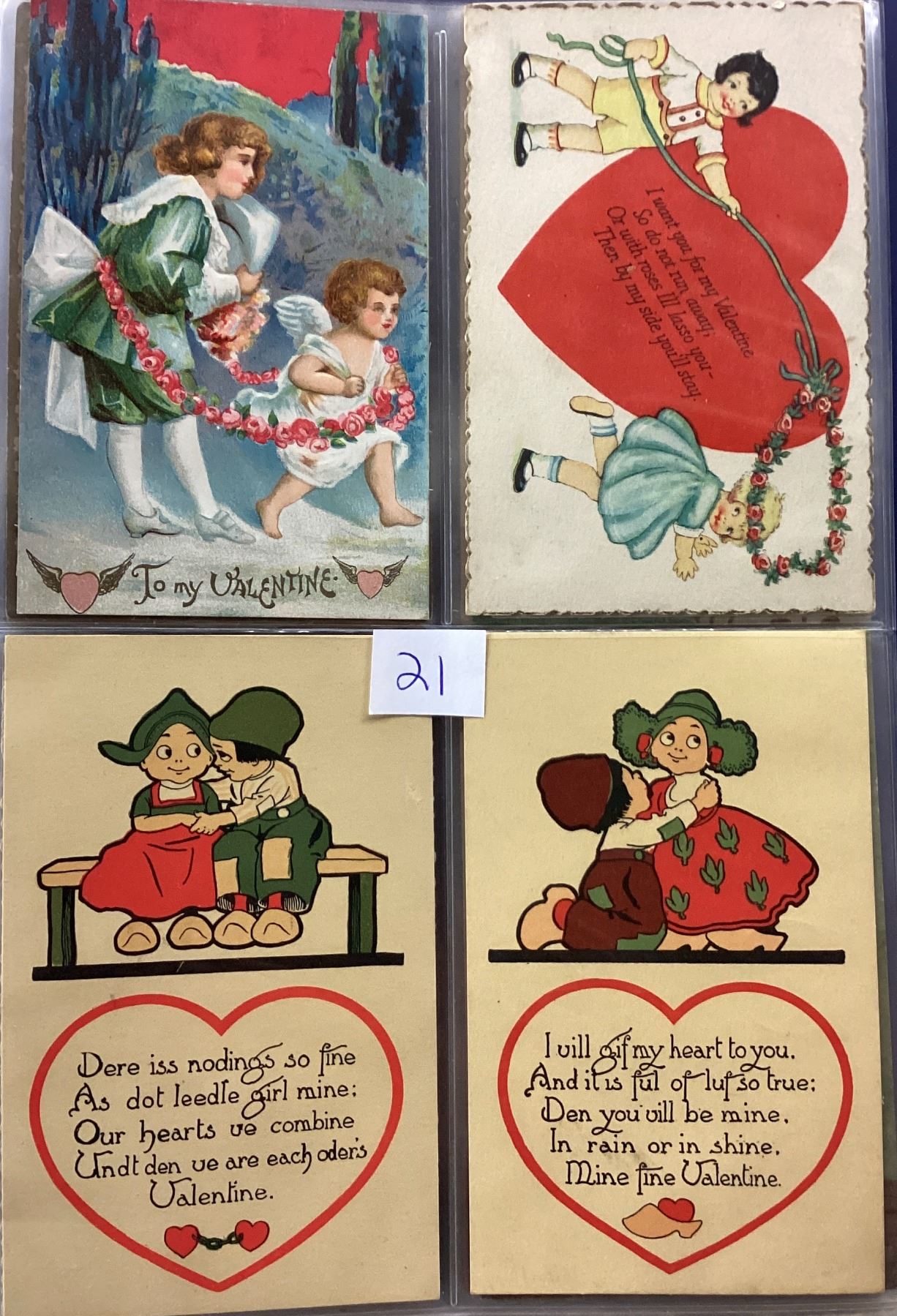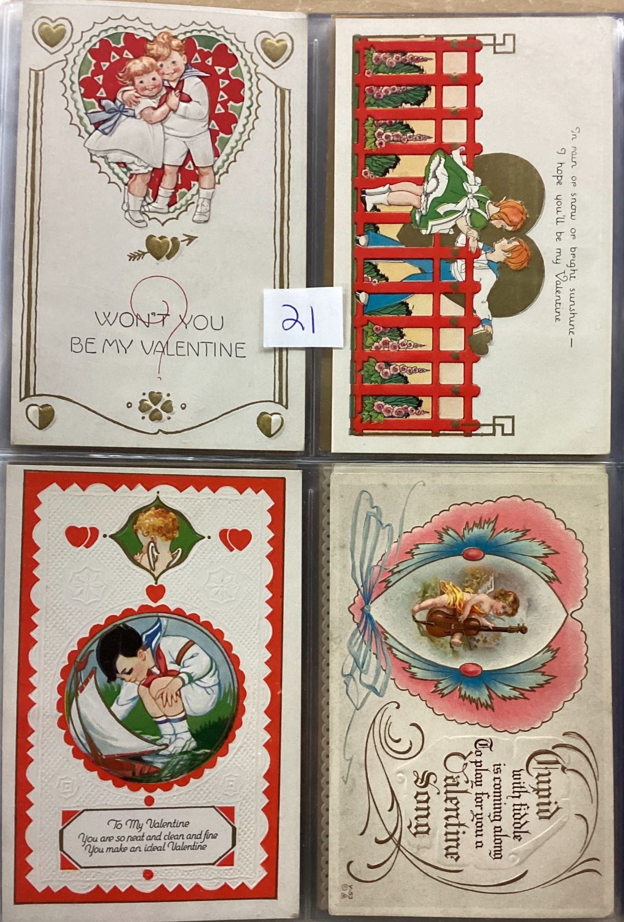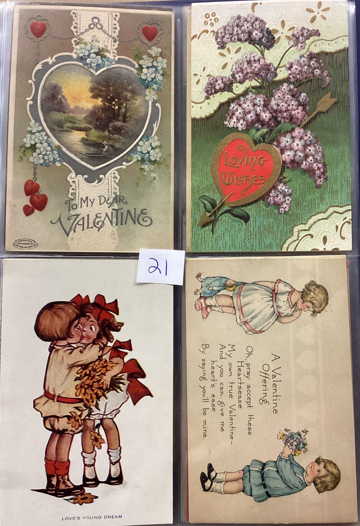 Album of over 40 Valentine postcards. Many with children, angels, cupid.