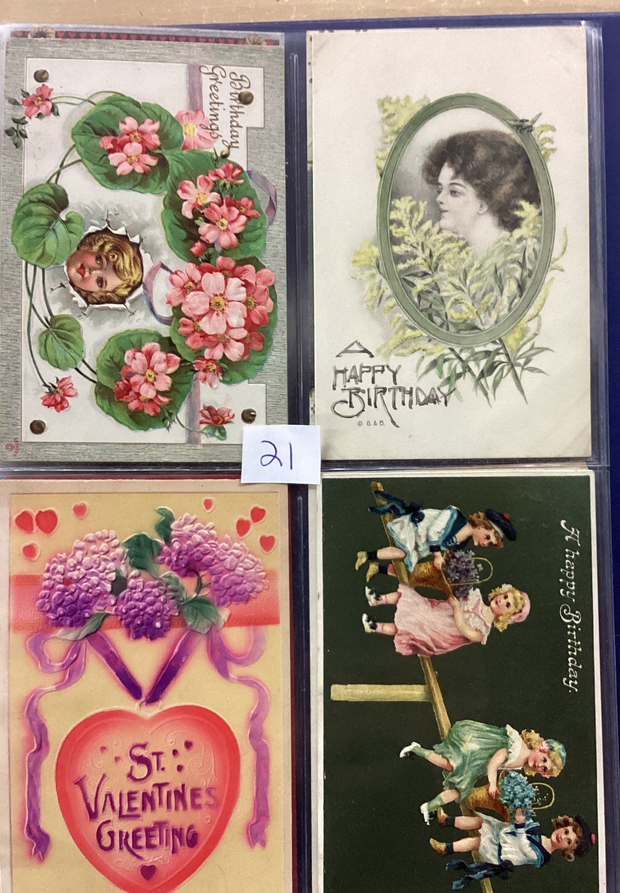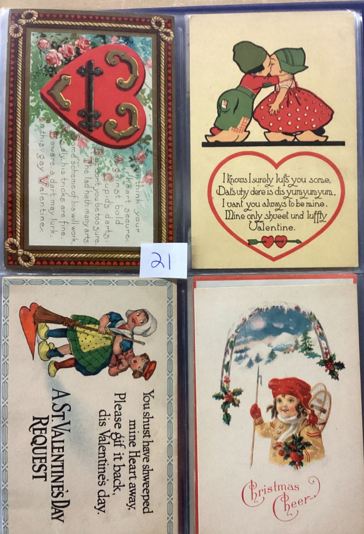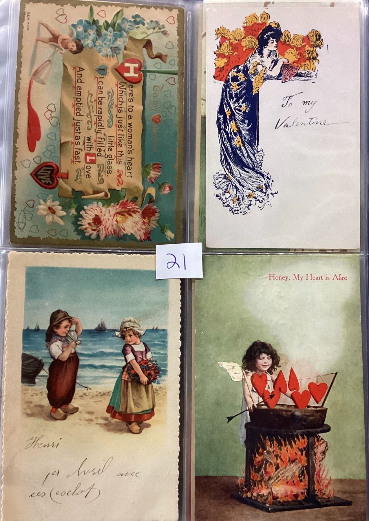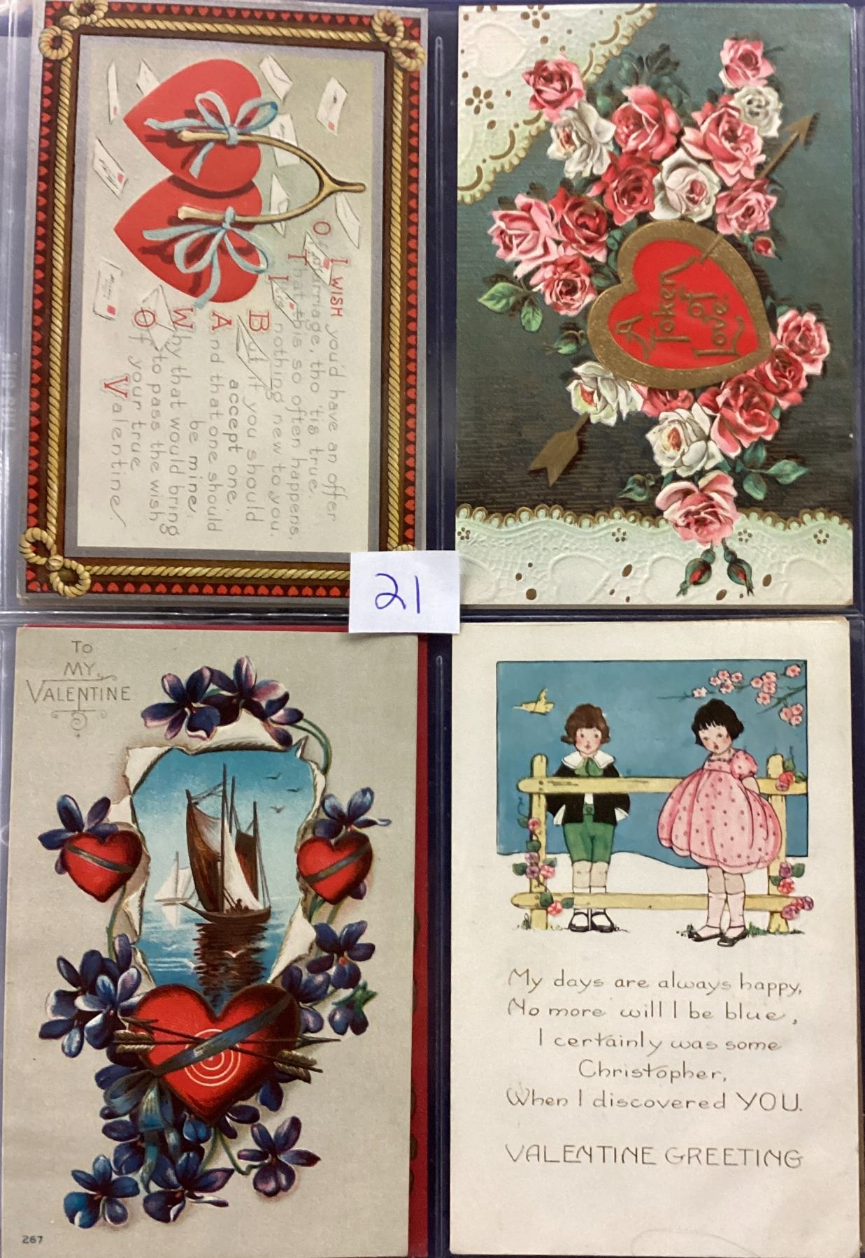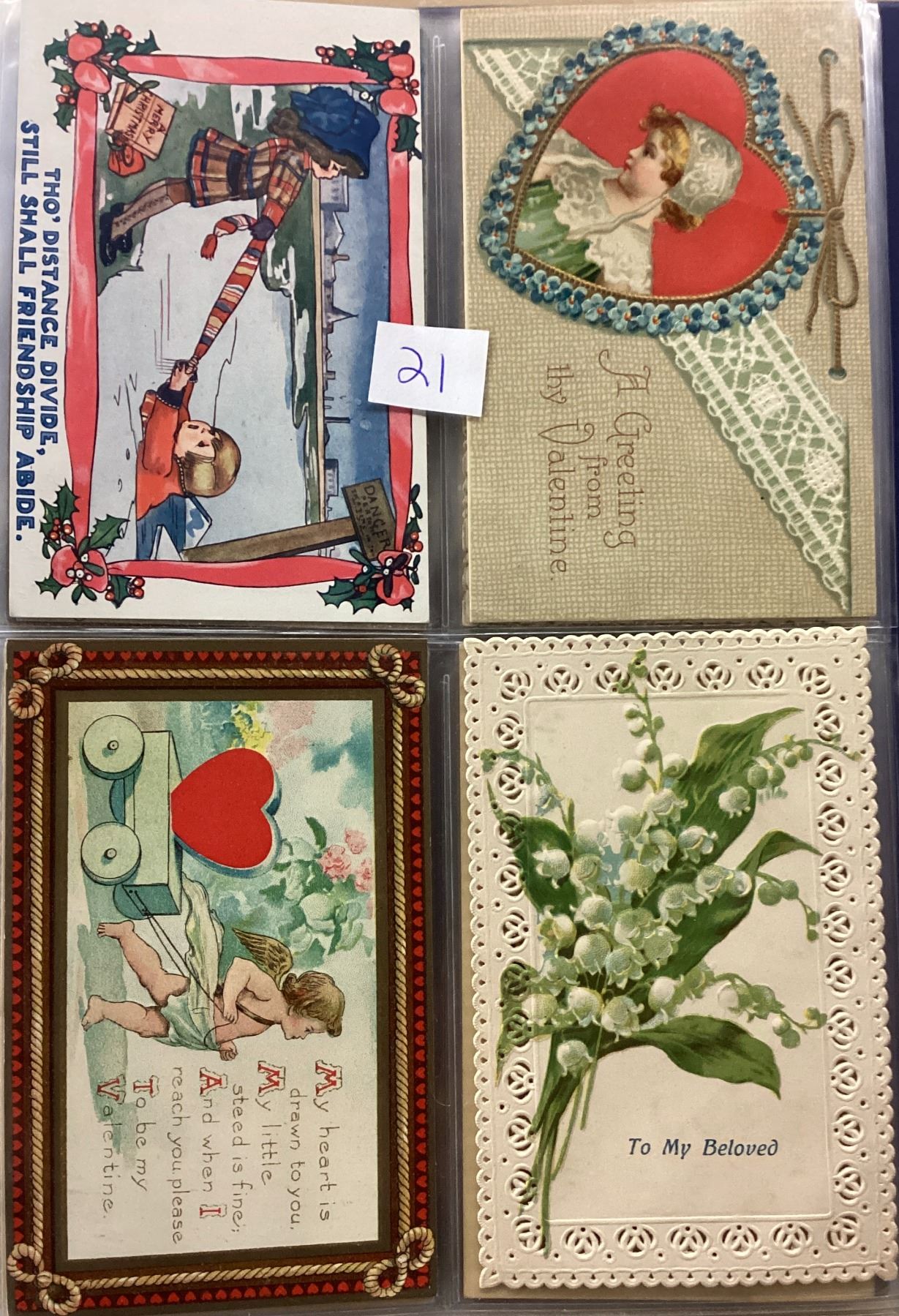 Album of over 40 Valentine postcards. Many with children, angels, cupid.