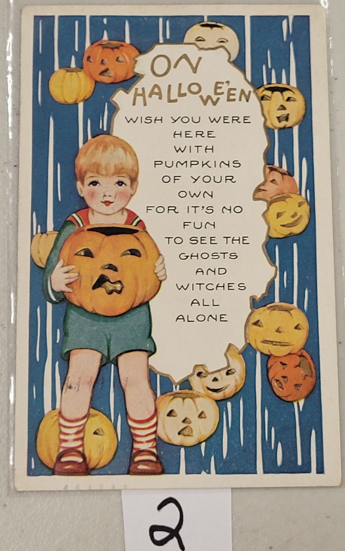 Whitney Boy Holding Pumpkin & Floating Pumpkins Halloween Postcards