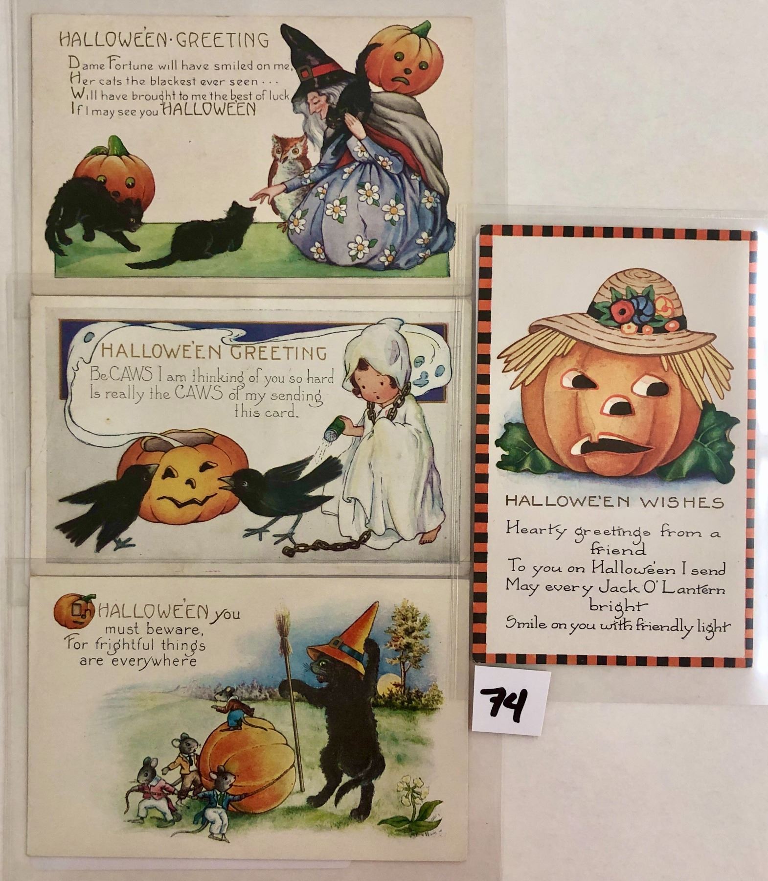 4 Whitney Halloween postcards. Cats, witches, pumpkins.