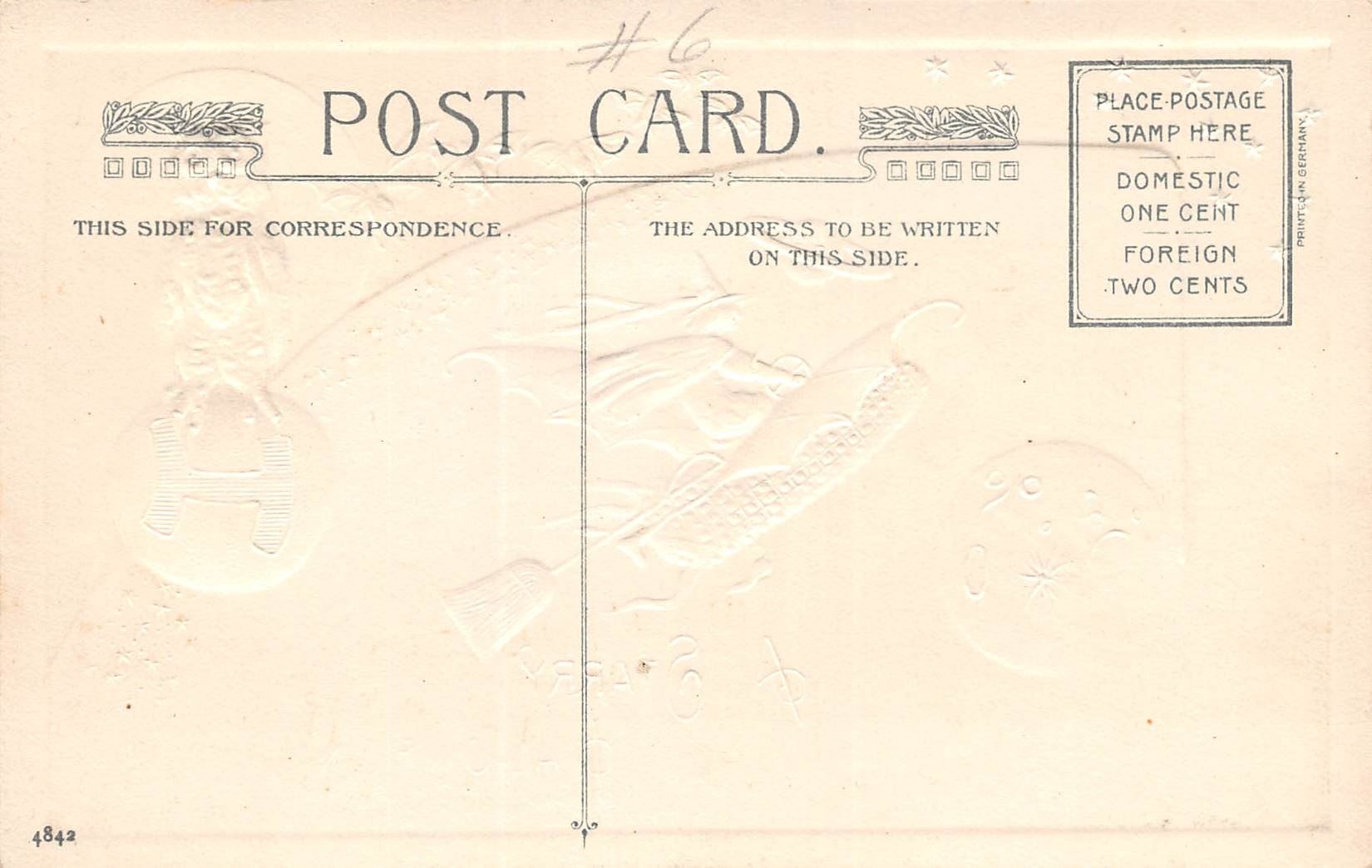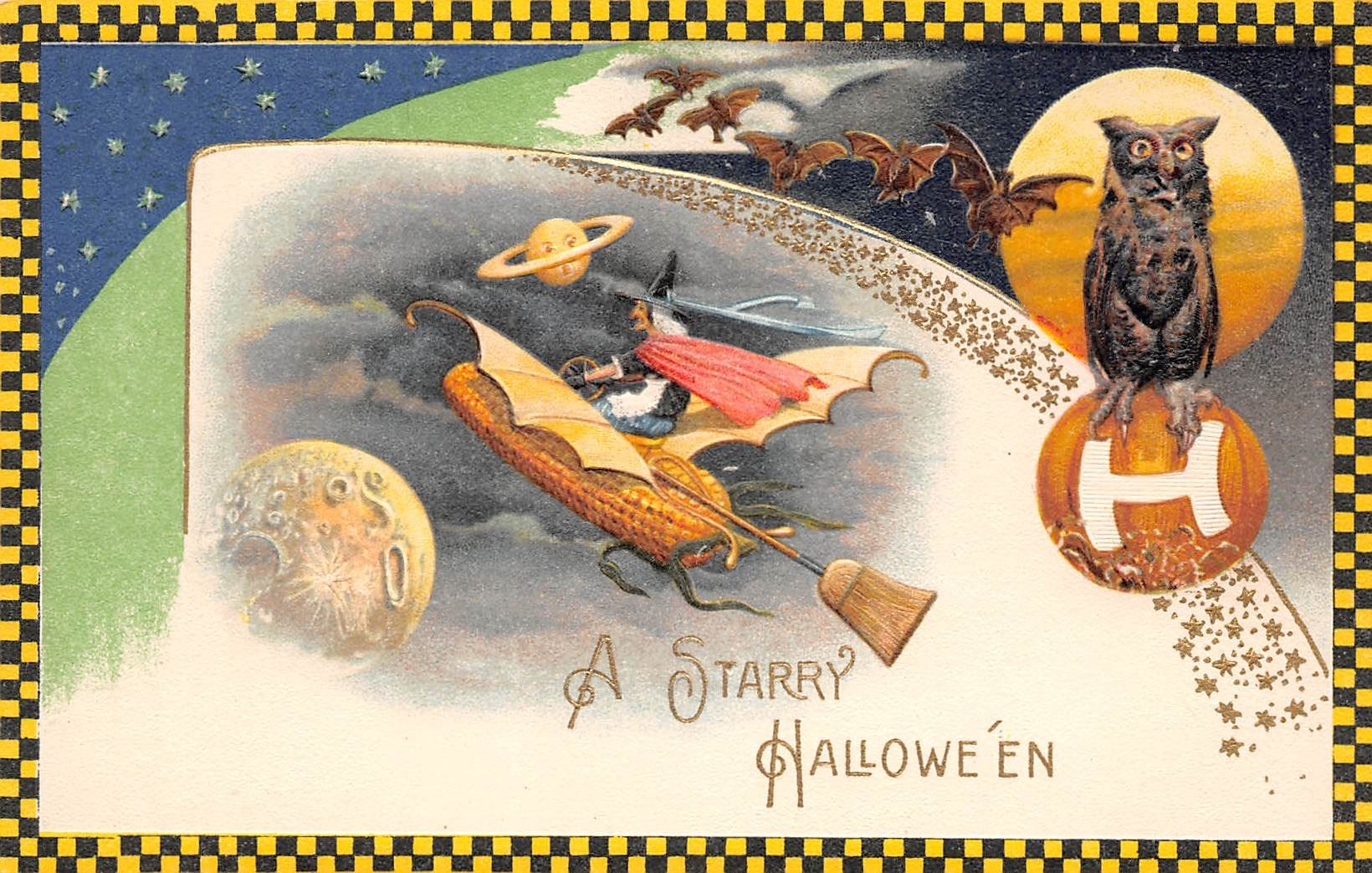 Winsch Halloween "A Starry Hallowe'en" Witch & Bats Checkered Border Holiday Greeting PC