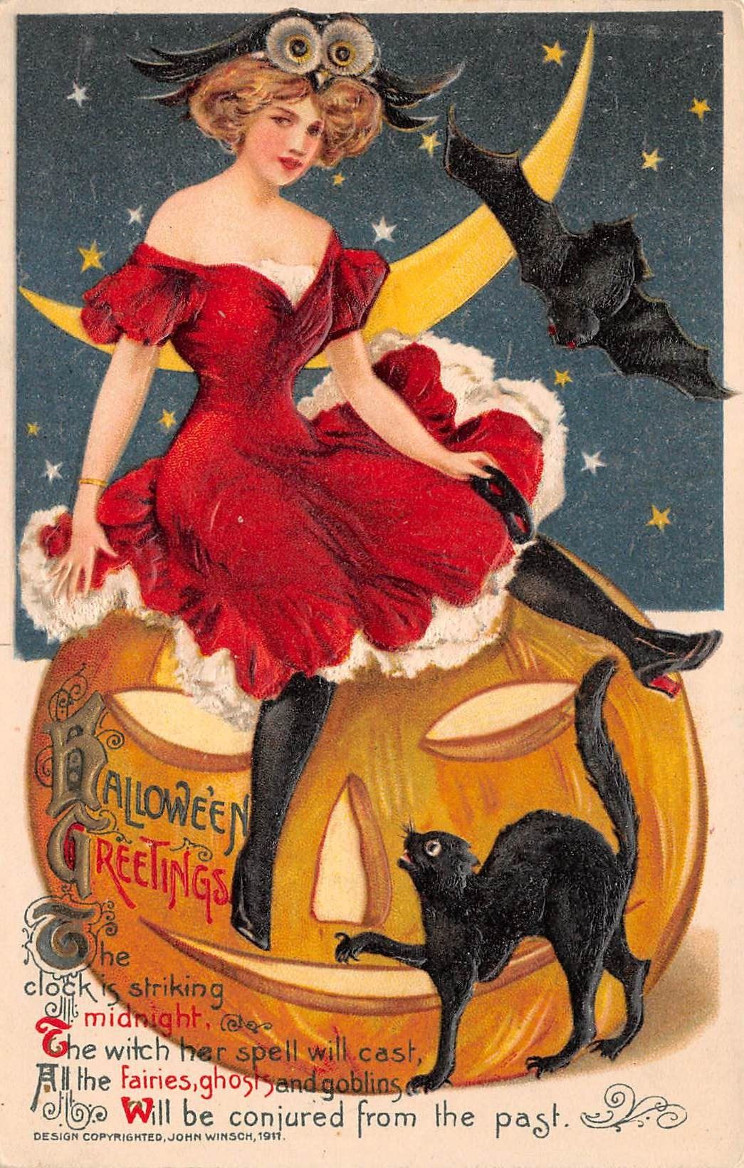 Winsch Halloween "Halloween Greeting" Girl in Red on Pumpkin with Bat & Cat Postcard
