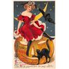 Winsch Halloween  Halloween Greeting  Girl in Red on Pumpkin with Bat & Cat Postcard