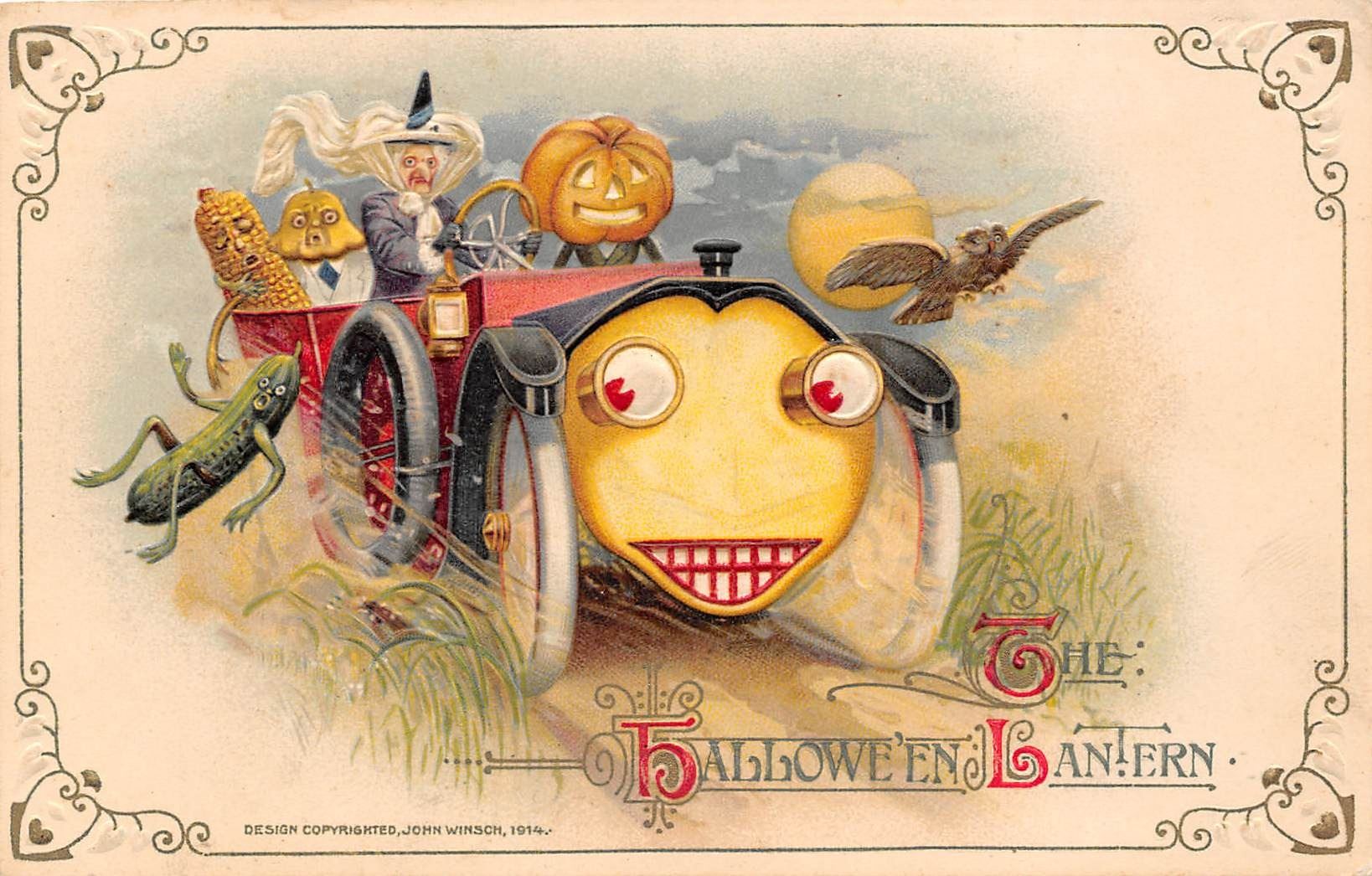 Winsch Halloween Witch Driving "The Halloween Lantern" Holiday Greeting Postcard