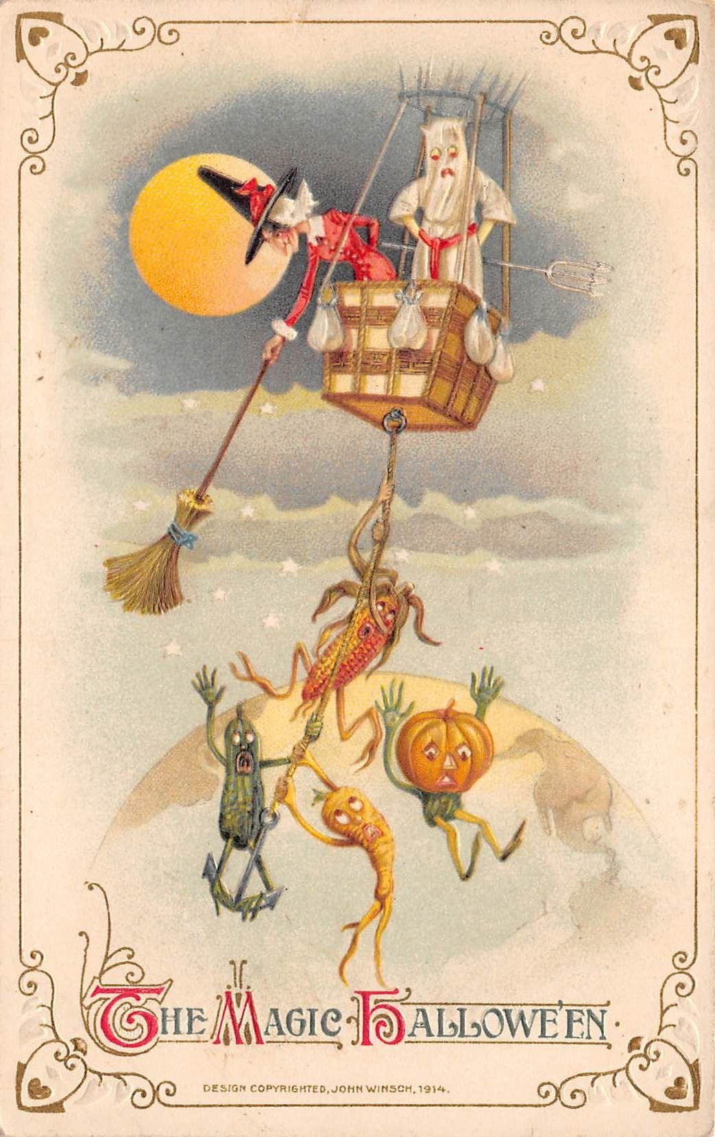 Winsch Halloween Witch & Ghost Hot Air Ballon Holiday Greeting Postcard