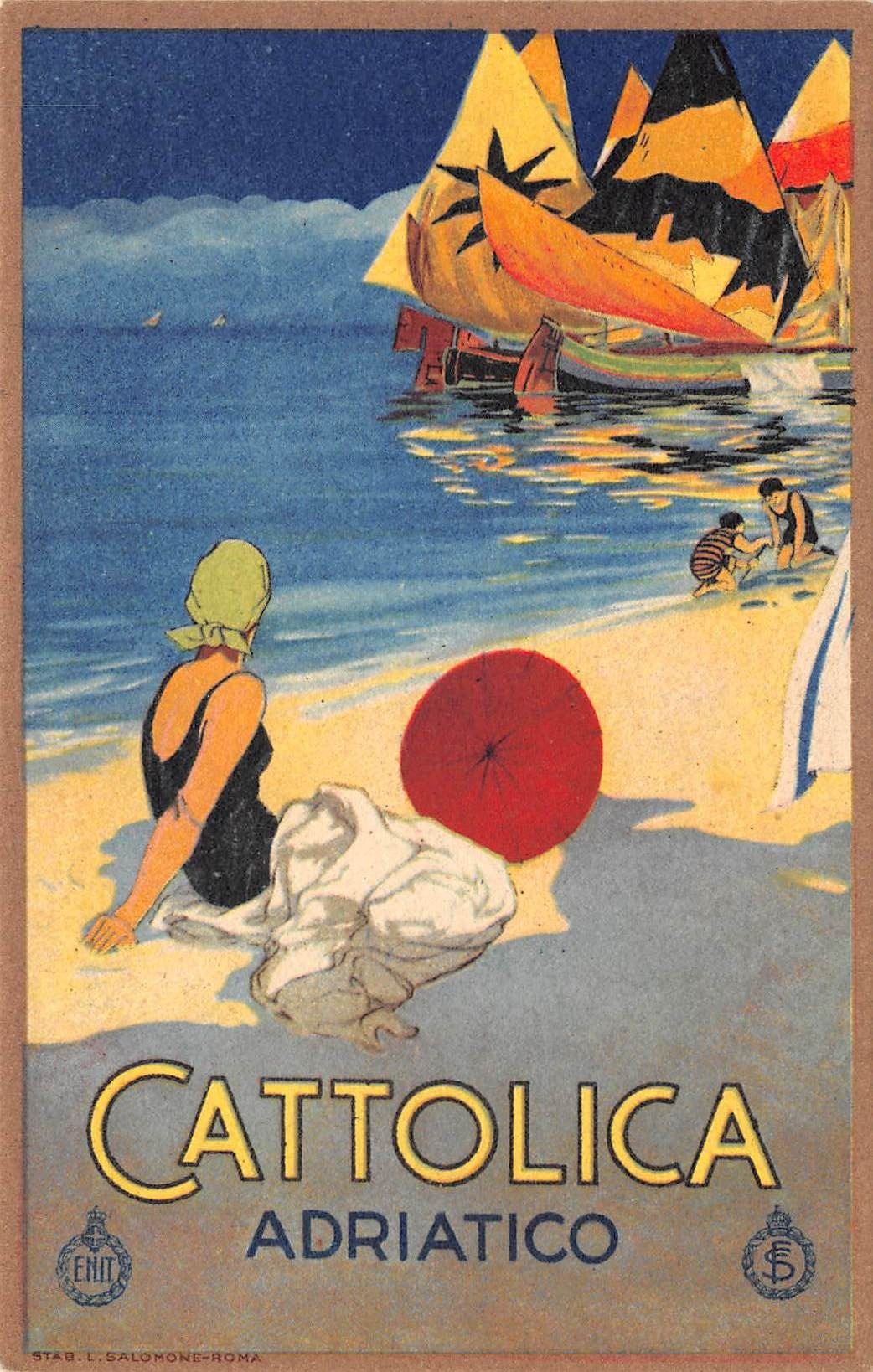 Woman on Beach Italian Poster Art Cattolica Adriatico Postcard