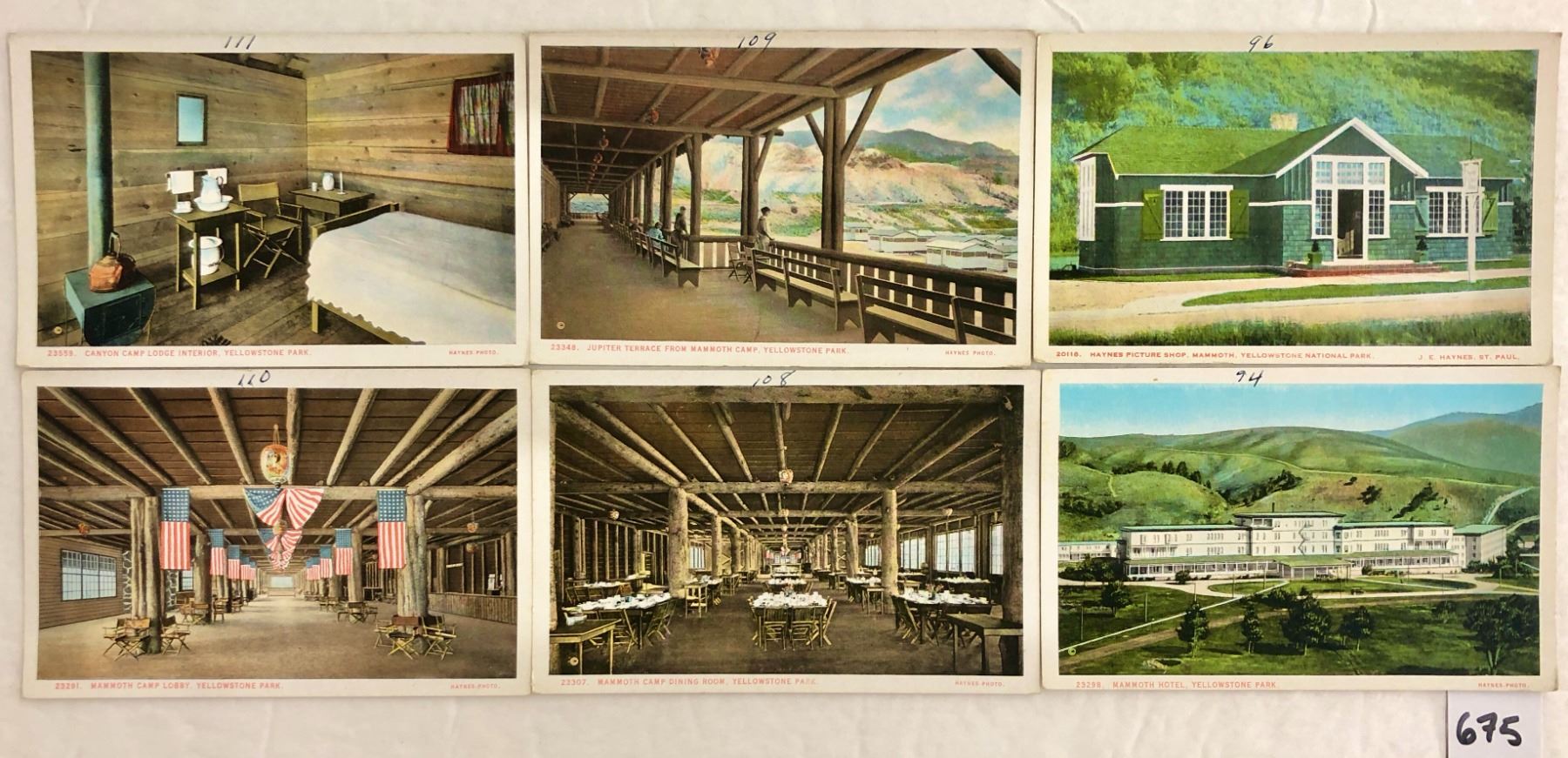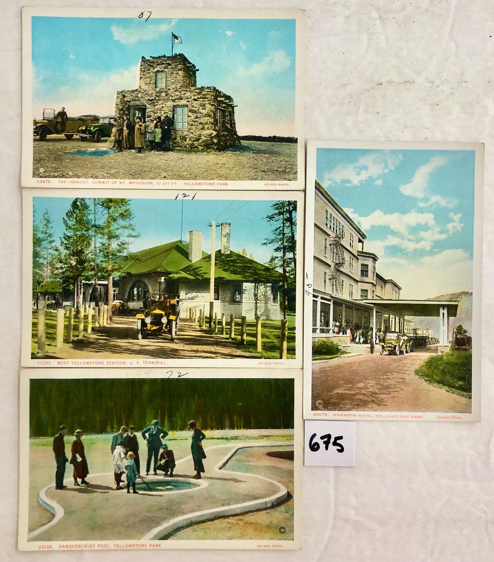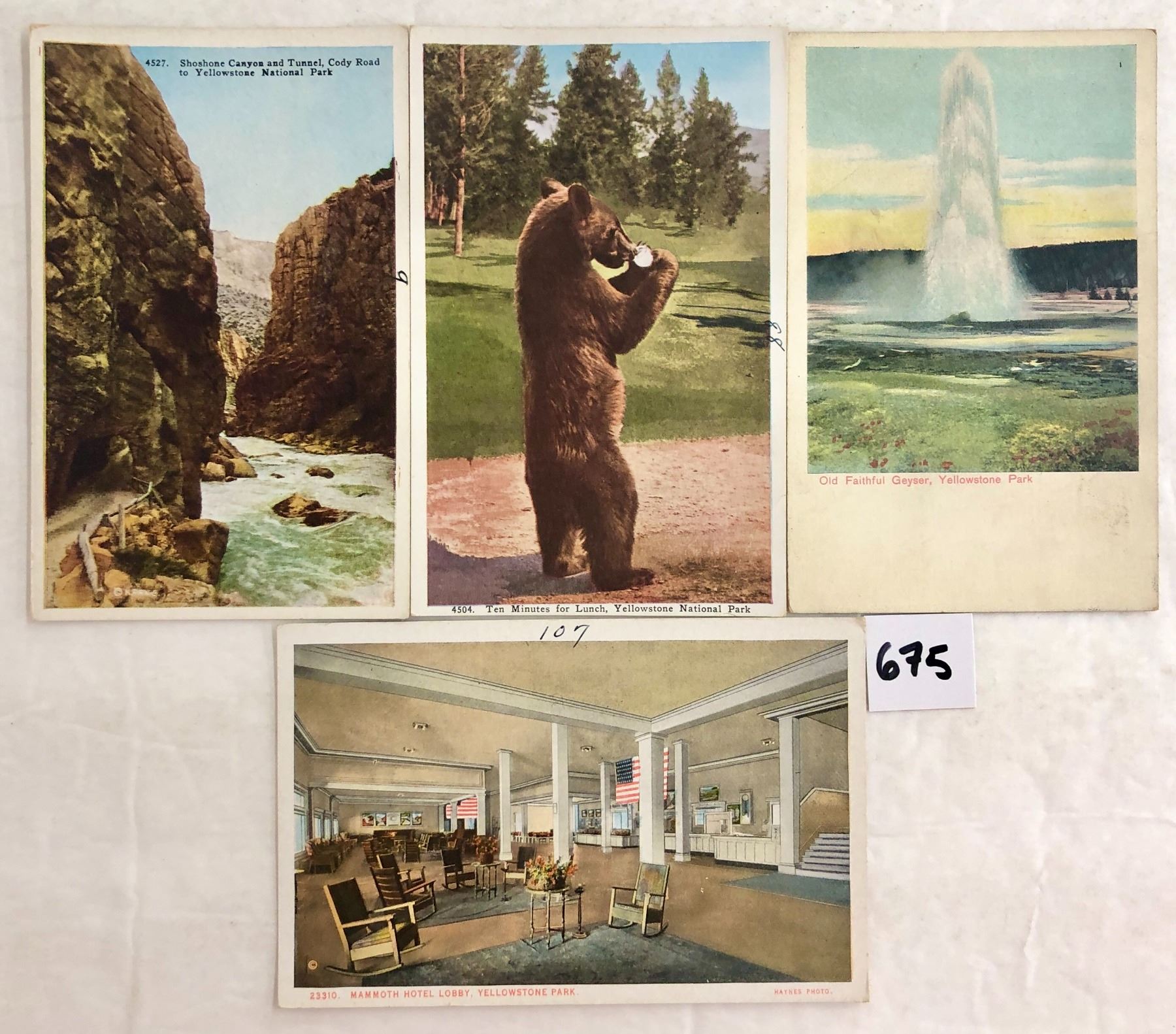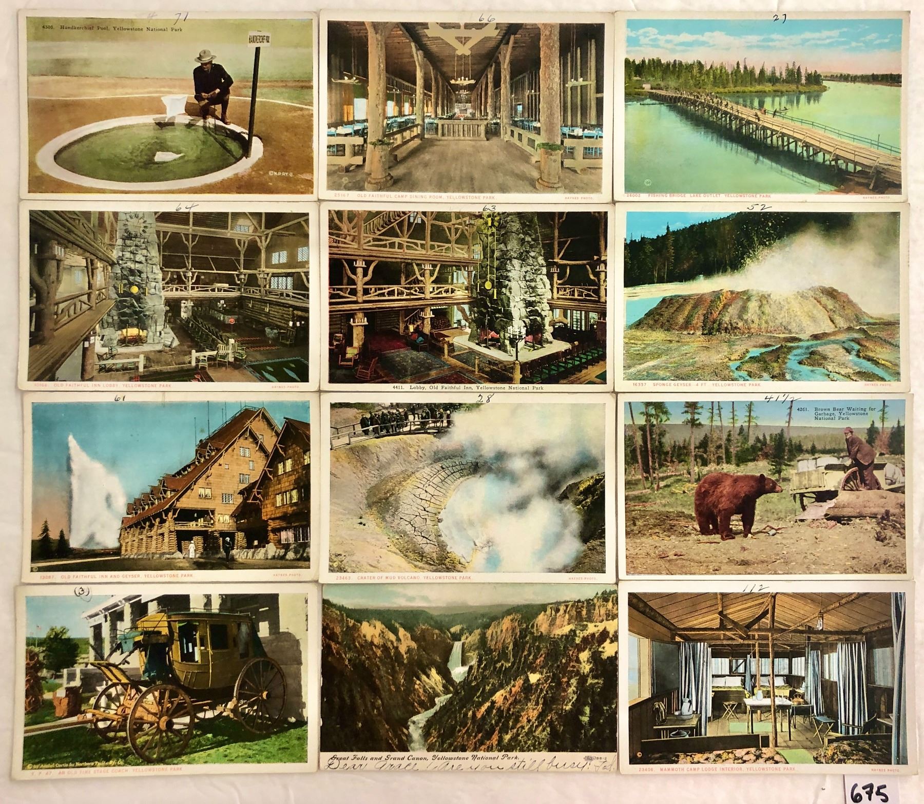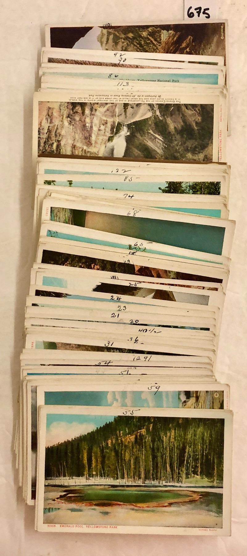 Approx. 130 Yellowstone postcards. Early. Many cards have a number written in pen in the border. Many Haynes.